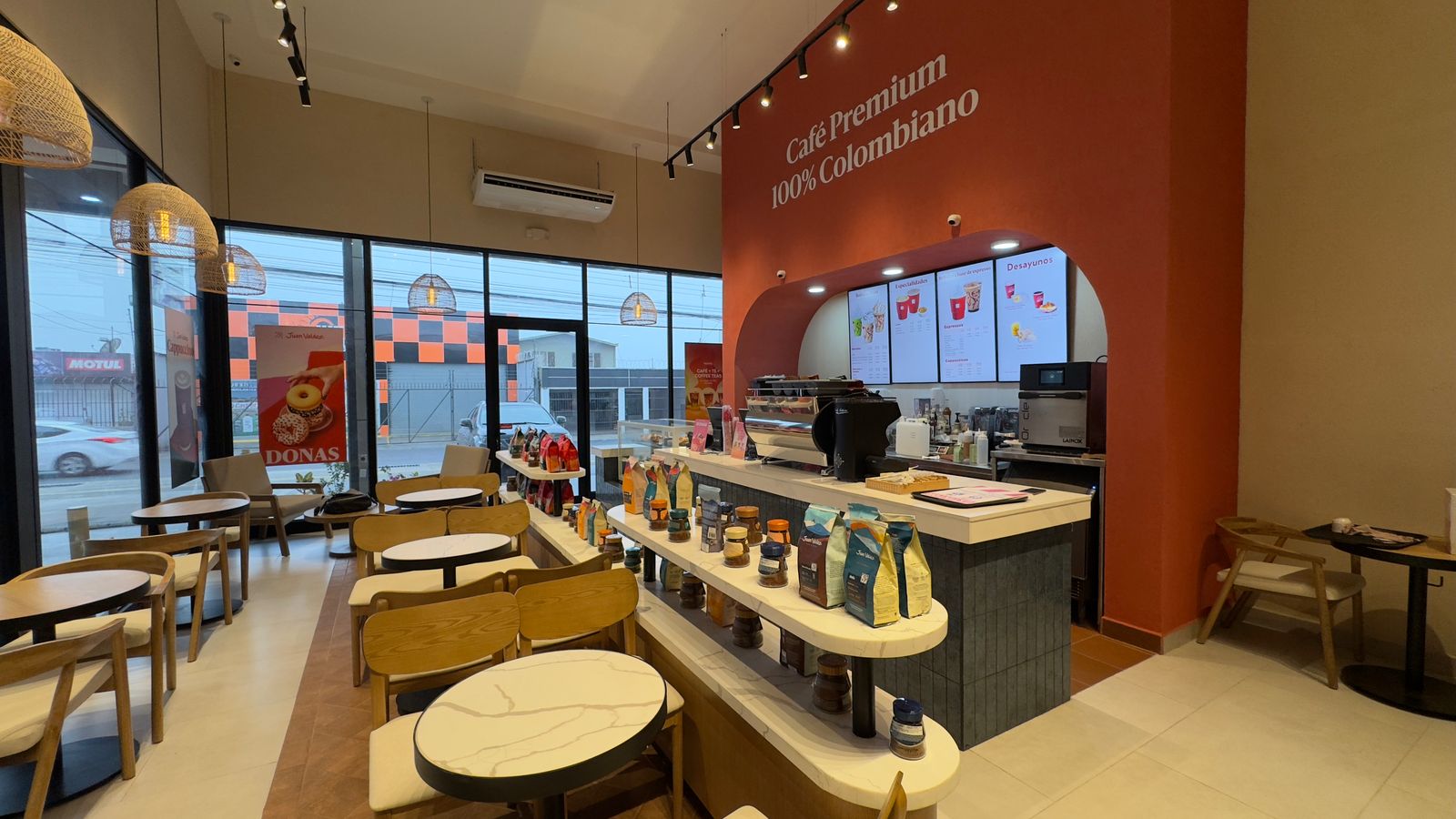 En un local de 150 metros cuadrados y dos pisos, el nuevo Juan Valdez Café tiene capacidad para 60 personas cómodamente sentadas en su salón. El punto incluye una nueva tendencia en decoración, con mobiliario moderno, más iluminación, mesas amplías para reuniones de trabajo, murales, una isla con productos empacados y parqueo para sus clientes.