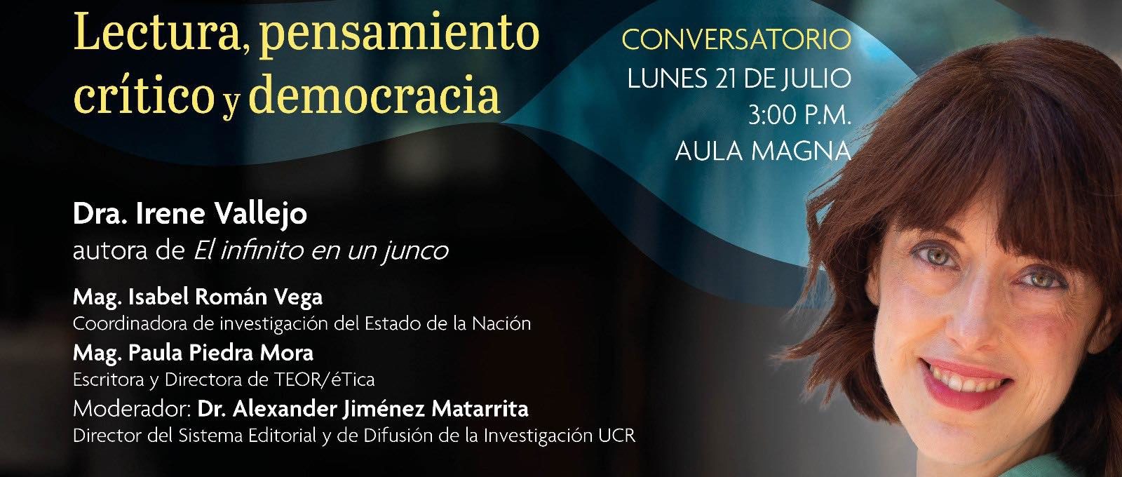 La Rectoría de la Universidad de Costa Rica (UCR) tomó la decisión de realizar, el día 21 de julio de 2025, el conversatorio “Lectura, pensamiento crítico y democracia” con Irene Vallejo, autora del libro El infinito en un junco, y la pregunta que me surge es la siguiente: ¿cuáles son los libros de la señora Vallejo que abordan los problemas de la democracia, la crisis de las instituciones, el destronamiento de la verdad, el surgimiento de los populismos y de los autoritarismos en las sociedades contemporáneas? Planteo interrogantes como un ciudadano comprometido con la rendición de cuentas de los fondos públicos del país y con el estado de nuestra democracia.