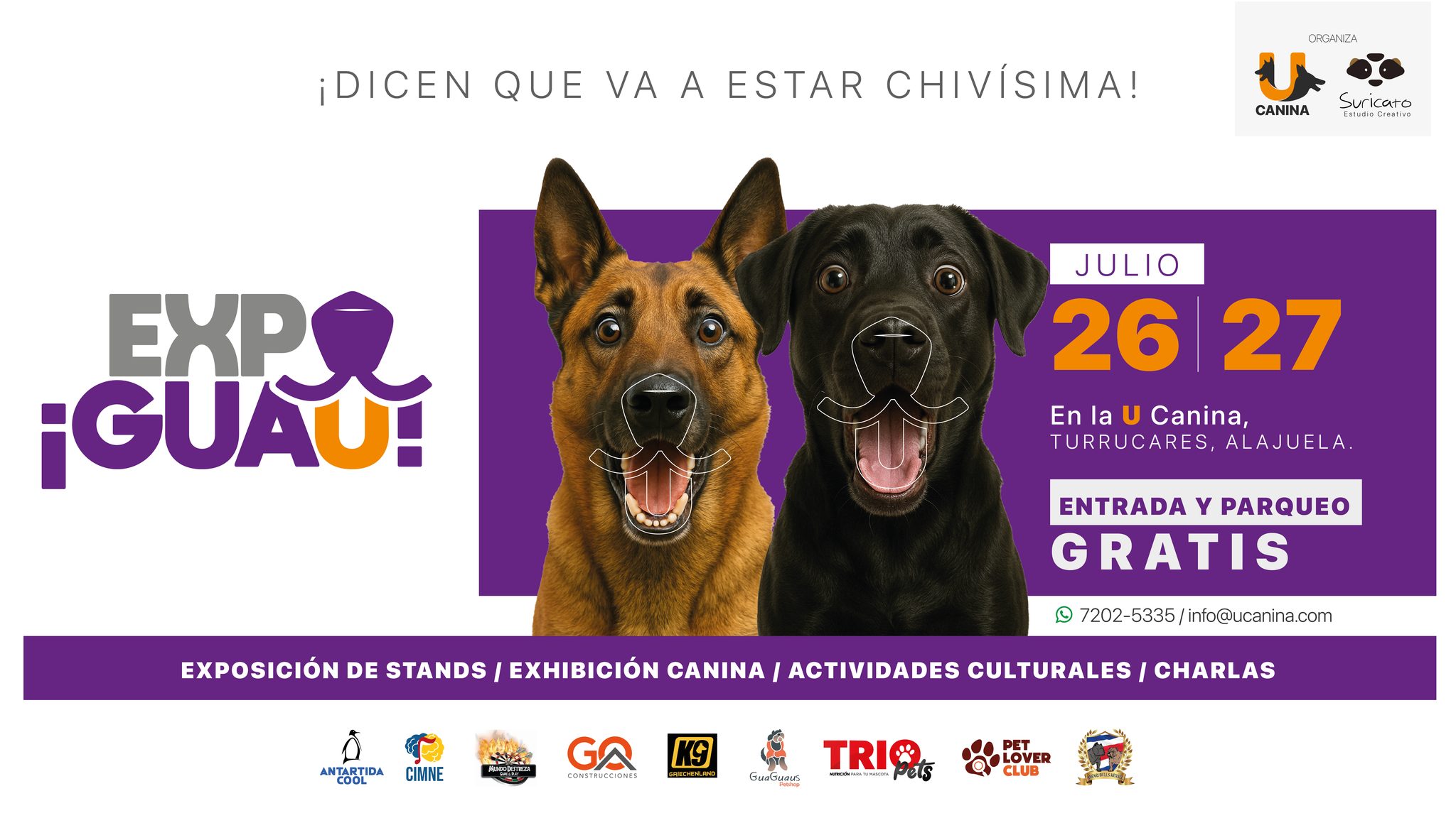 La Expo ¡Guau! se llevará a cabo el sábado 26 y domingo 27 de julio en las instalaciones de La U Canina, en Turrúcares de Alajuela, como un evento educativo y recreativo enfocado en fomentar la tenencia responsable de perros.