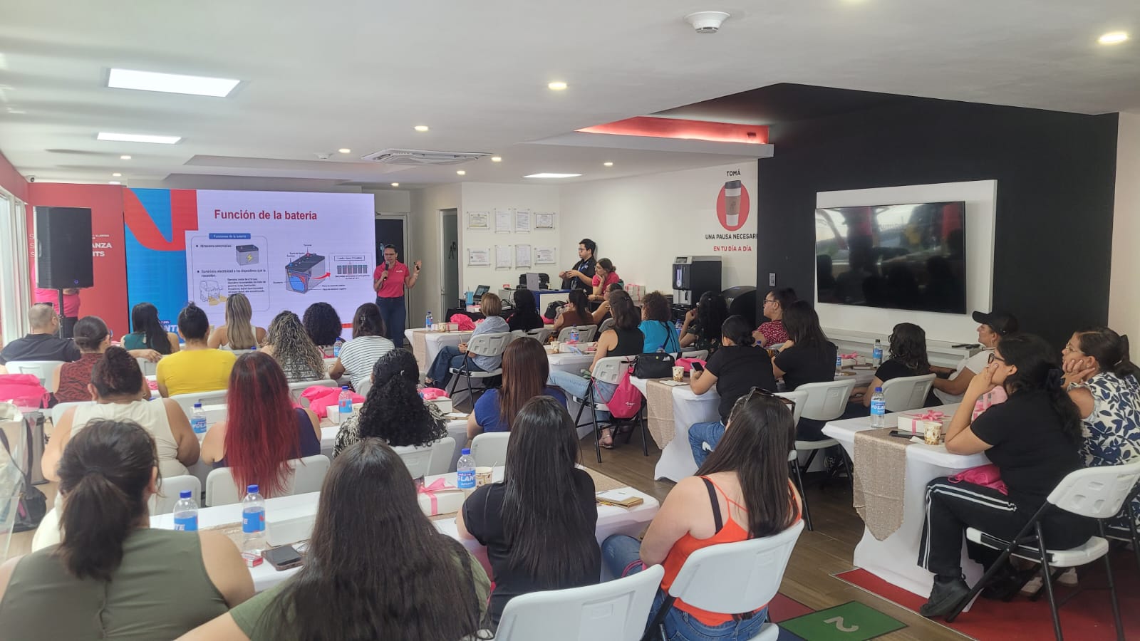 El taller, a cargo de Jeimy Sandoval, experta técnica de Autopits, se divide en dos partes: una charla inicial sobre componentes y partes del vehículo, en la que se atienden las dudas de las asistentes, y una sesión práctica con demostraciones sobre cambio de llantas, relleno de líquidos y funcionamiento de distintos dispositivos automotrices.