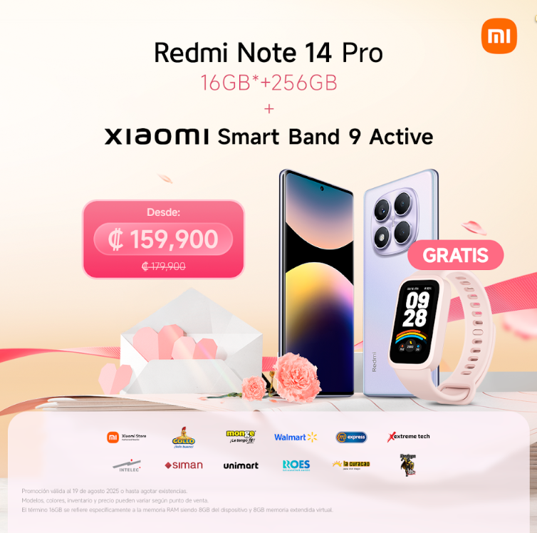 - Redmi Note 14 Pro (8+256 GB): Precio en promoción de ₡159,900 + Regalo: Smart Band Active 9 rosada