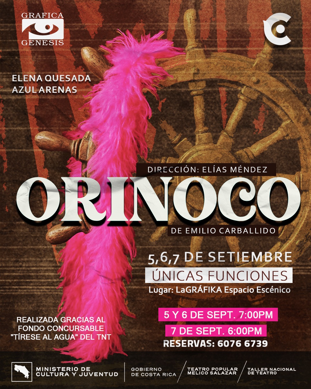 Del 5 al 7 de septiembre, el colectivo teatral Teatro Cinco presenta Orinoco, del reconocido dramaturgo mexicano Emilio Carballido. Bajo la dirección de Elías Méndez, y con las actuaciones de Ana Elena Quesada y Azul Arenas, esta puesta en escena promete conmover, divertrir y provocar reflexión en el público costarricense.