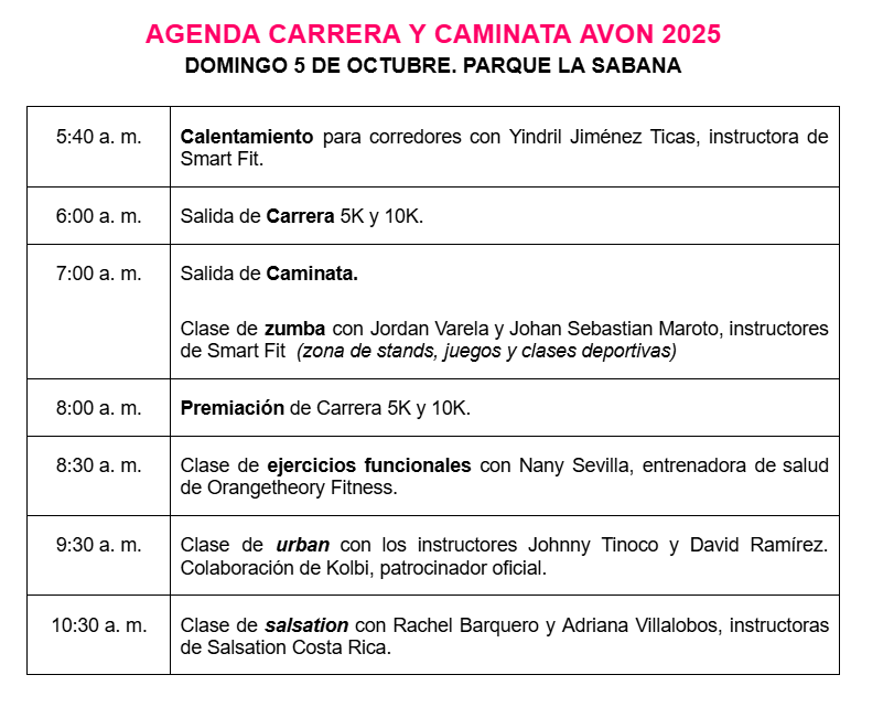 Mayores detalles de esta iniciativa pueden consultarse en el sitio carreracaminata.avon.cr También en la página en Facebook avoncr y en las cuentas en Instagram/TikTok avoncostarica y cadapasoesporvos.
