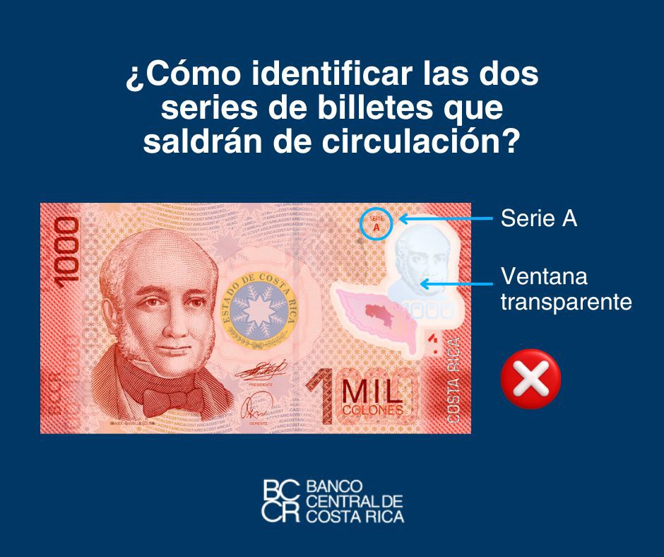 Con motivo de la próxima salida de circulación de los billetes de ¢1 000, series A y B, el Banco de Costa Rica (BCR) informa a sus clientes y público en general que recibirá estas denominaciones, para depósito o cambio, en todas sus oficinas a nivel nacional. A partir del lunes 3 de noviembre del presente año, quienes aún cuenten con esas denominaciones, pueden llevarlas al BCR para solicitar su cambio por dinero válido, de la siguiente manera: