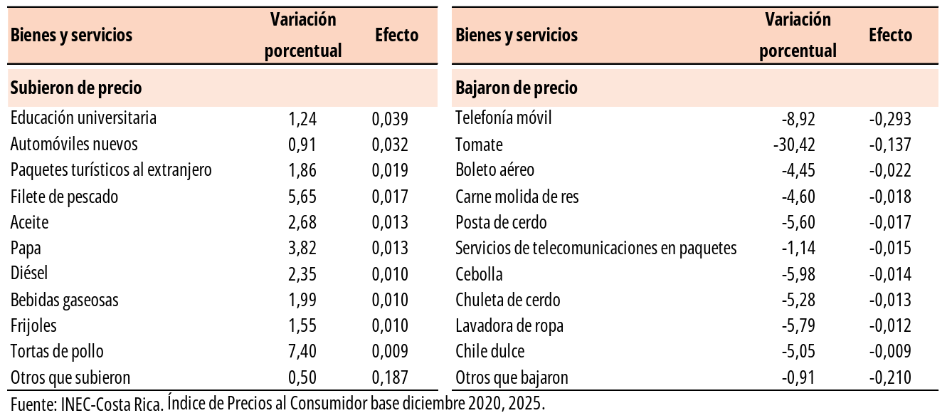 Los bienes y servicios que mostraron mayor efecto al alza en la variación mensual del índice fueron la educación universitaria, los automóviles nuevos y los paquetes turísticos al extranjero, mientras que los que más influyeron en el efecto a la baja fueron la telefonía móvil, el tomate y el boleto aéreo.