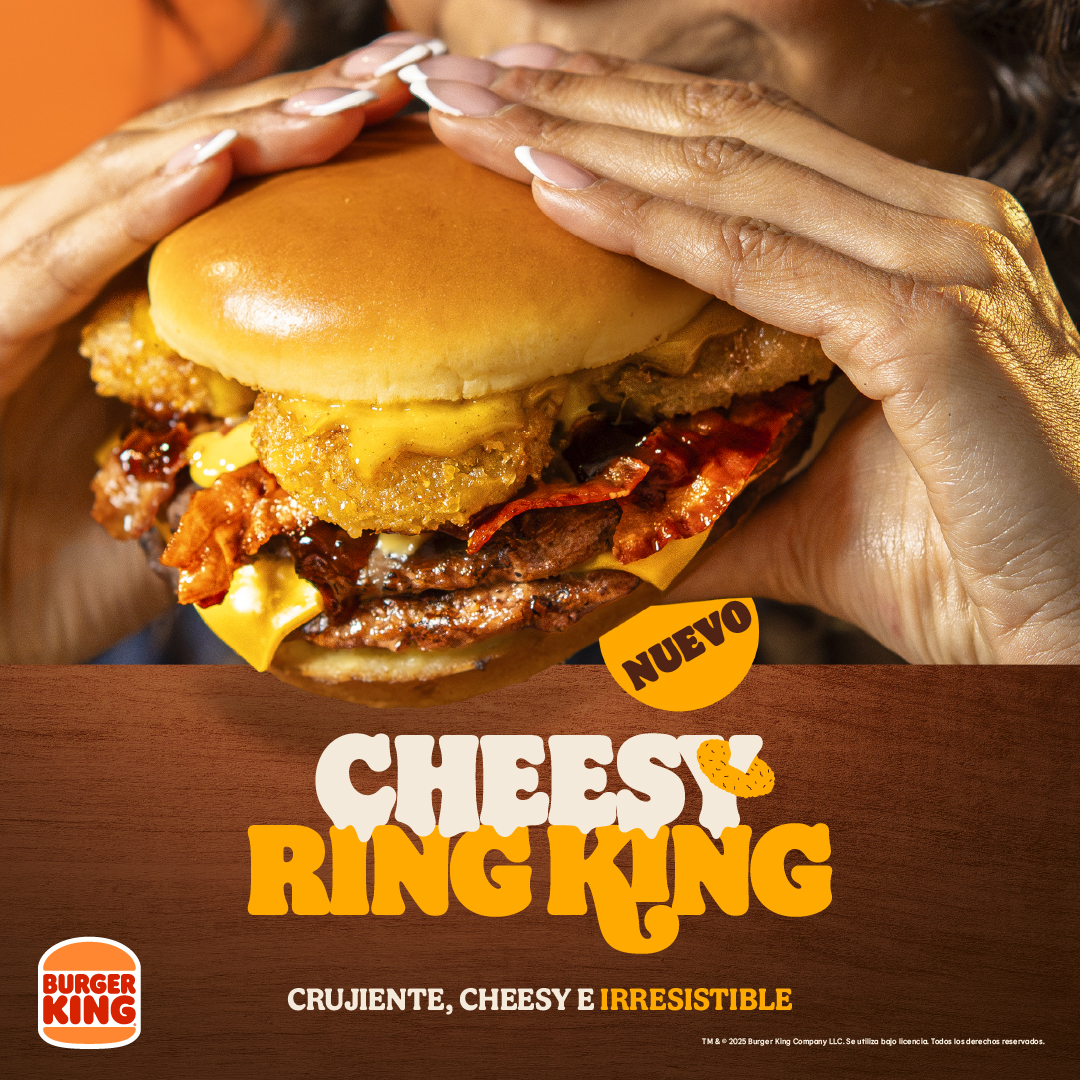 El nuevo Cheesy Ring King combina lo mejor de ambos sabores. Esta creación incluye dos tortas de carne, queso americano, salsa barbacoa, tres aros de mozzarella, tocino crujiente y salsa mostaza miel, todo dentro de un pan especial de papa que le da un toque suave y esponjoso. Es crujiente, cheesy e irresistible.