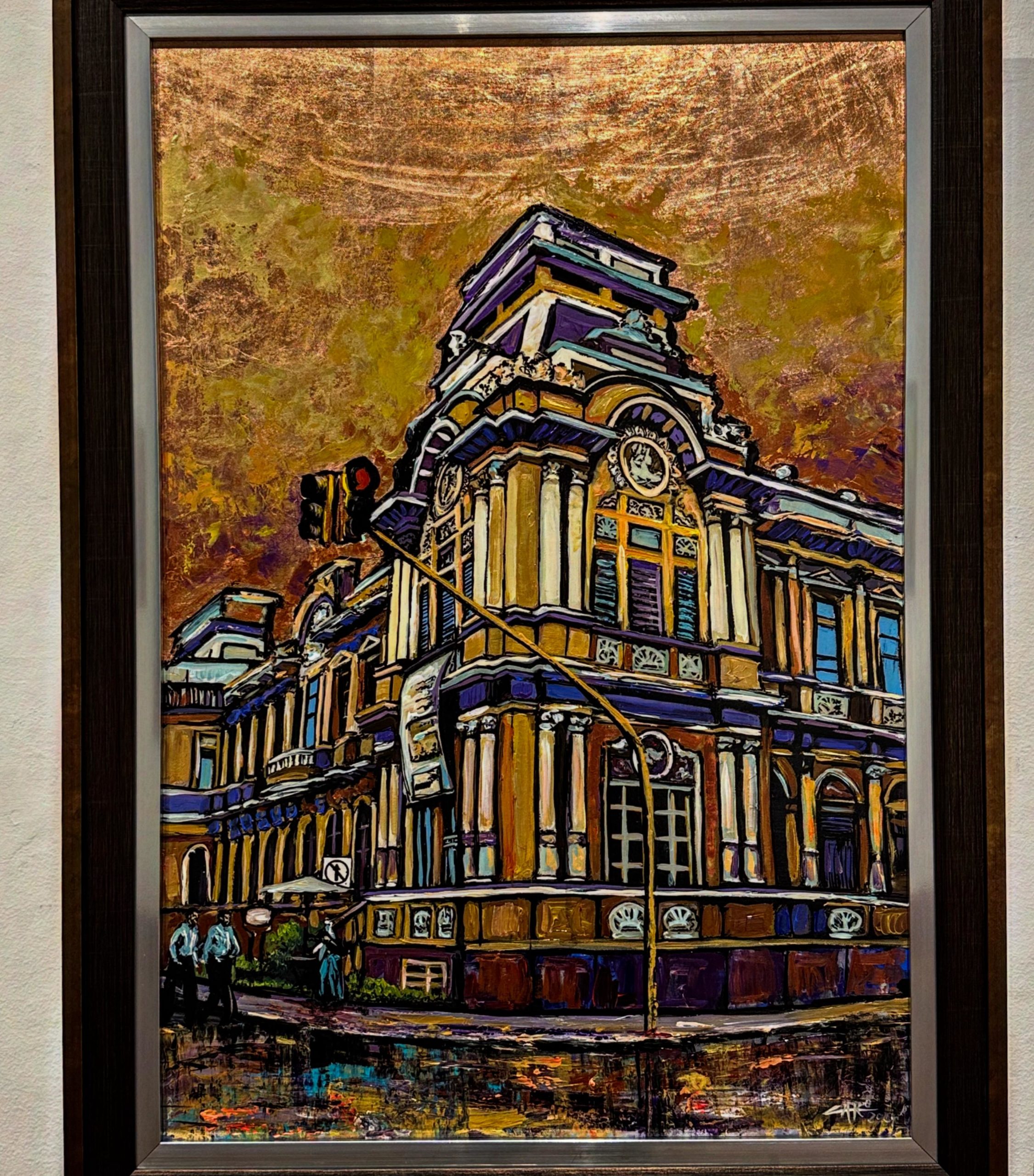 La muestra, abierta hasta el 30 de noviembre en Barrio Amón, presenta una serie de obras en acrílico y hoja de oro que evocan los espacios urbanos tradicionales de San José desde una mirada contemporánea.