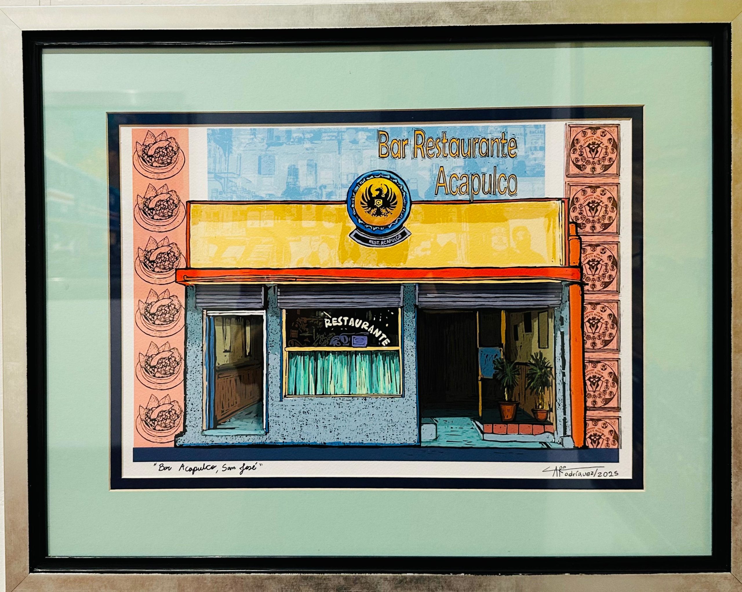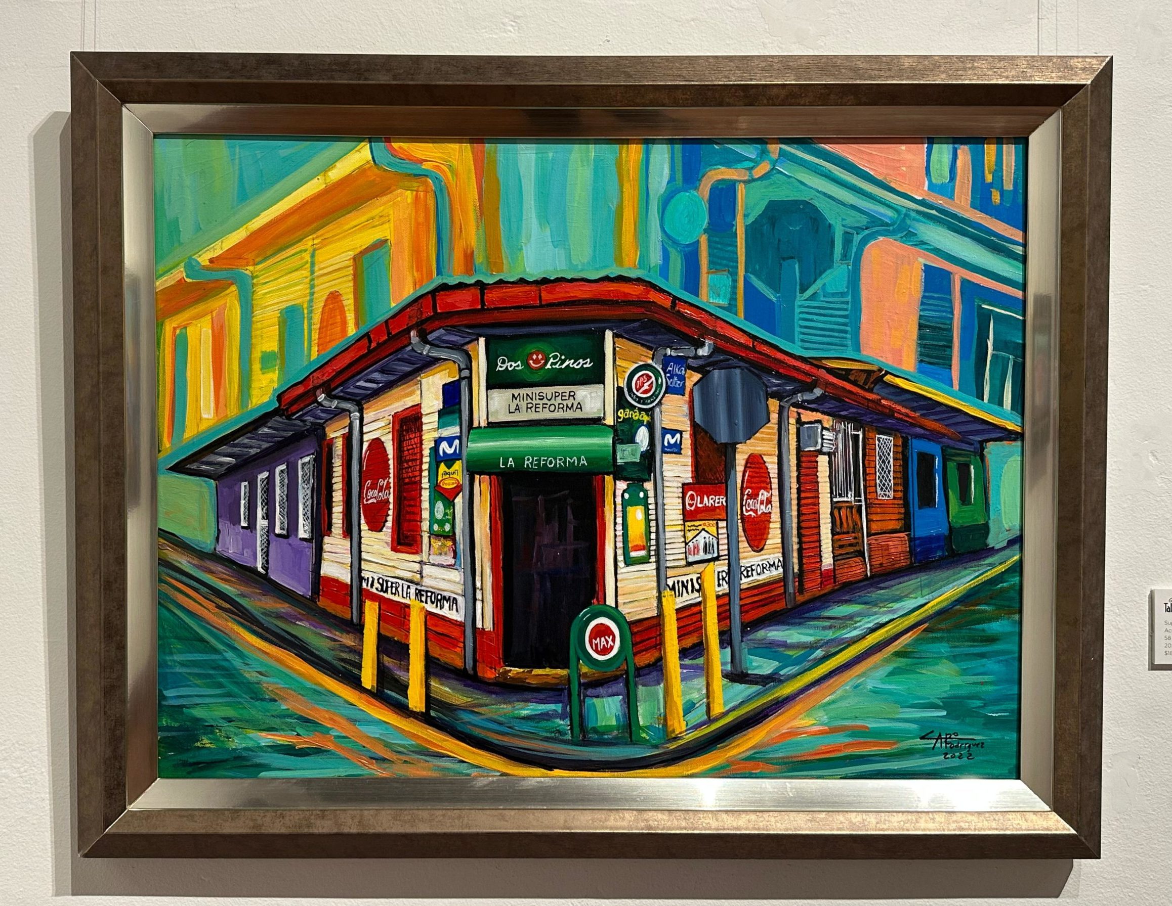 La exposición reúne una serie de obras en acrílico y hoja de oro sobre lienzo, inspiradas en los espacios urbanos tradicionales de San José —pulperías, trenes y bares— reinterpretados desde una perspectiva contemporánea que conecta la memoria colectiva con el presente.