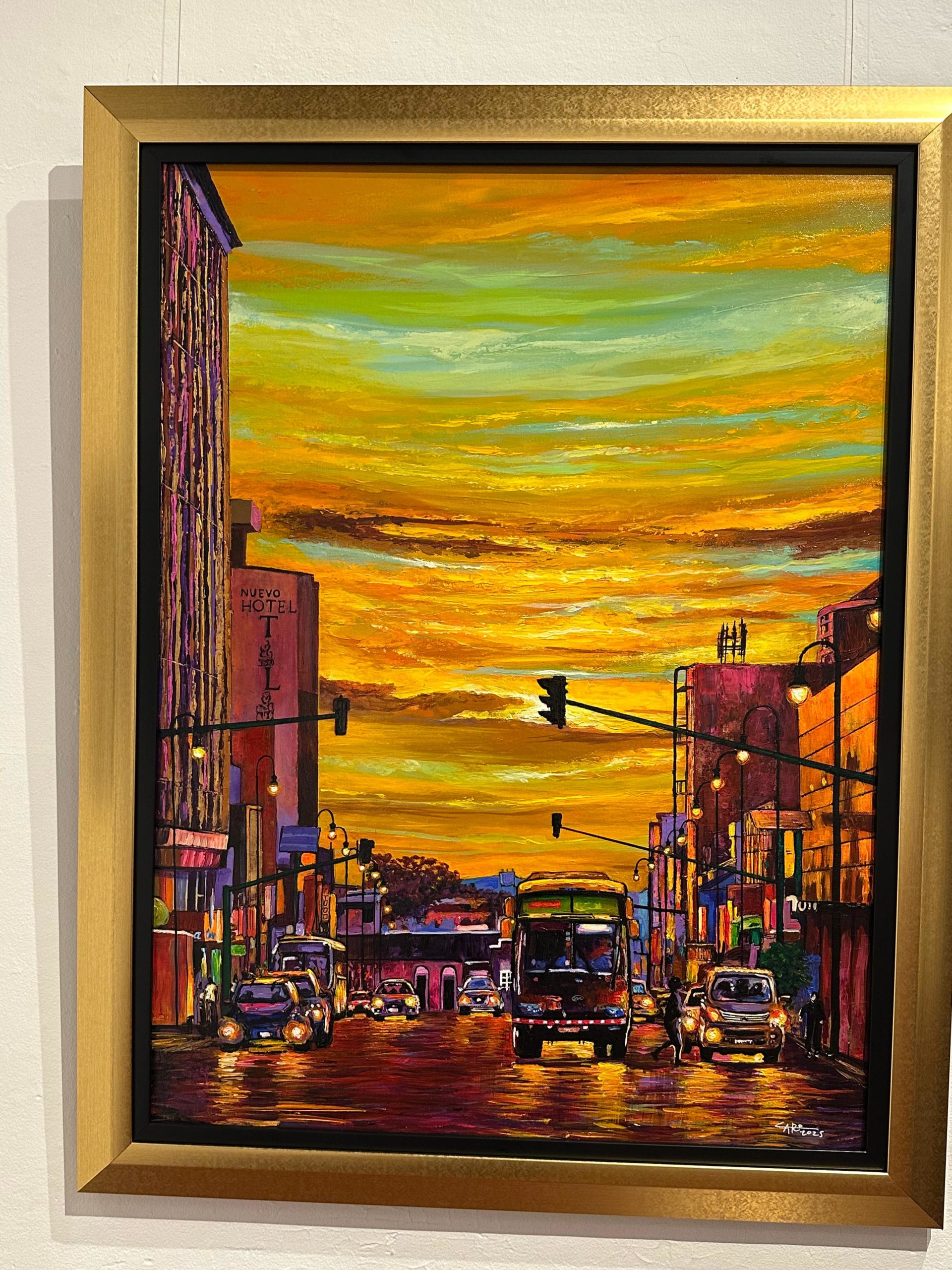 Entre la nostalgia y el presente, Carolina retrata también el fluir de los transeúntes que cruzan la ciudad bajo atardeceres de intensos tonos naranjas y dorados. La luz, el movimiento y el bullicio se convierten en metáforas de alegría, color, esperanza y del vínculo profundo con su tierra natal: la certeza de que, aun en la distancia, siempre hay un regreso posible al terruño que la habita”.