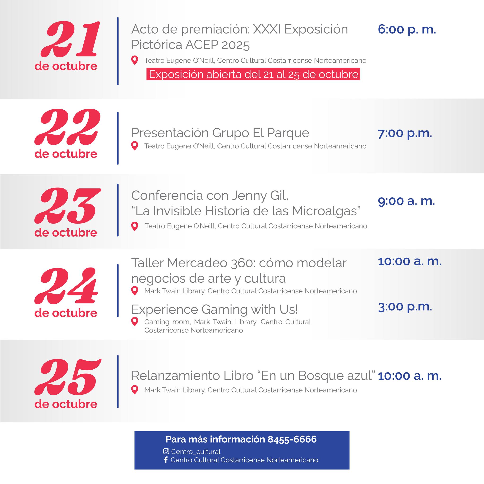 La agenda inicia el 21 de octubre a las 6:00 p.m. con el acto de premiación de la XXXI Exposición Pictórica ACEP 2025, que permanecerá abierta al público hasta el viernes 25 de octubre.