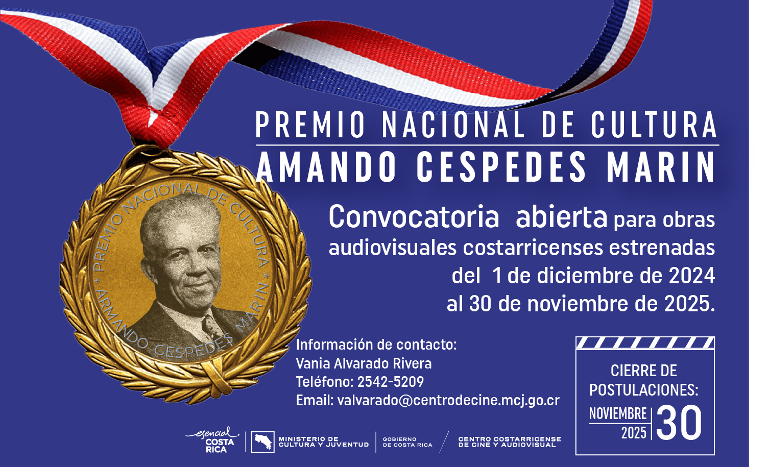 El Ministerio de Cultura y Juventud, a través del Centro Costarricense de Cine y Audiovisual (Centro de Cine) recuerda que se encuentra abierta la convocatoria para la inscripción de postulaciones al Premio Nacional de Artes Audiovisuales Amando Céspedes Marín 2025, cuya fecha límite de inscripción es el 30 de noviembre de 2025 a las 11:59 p.m.