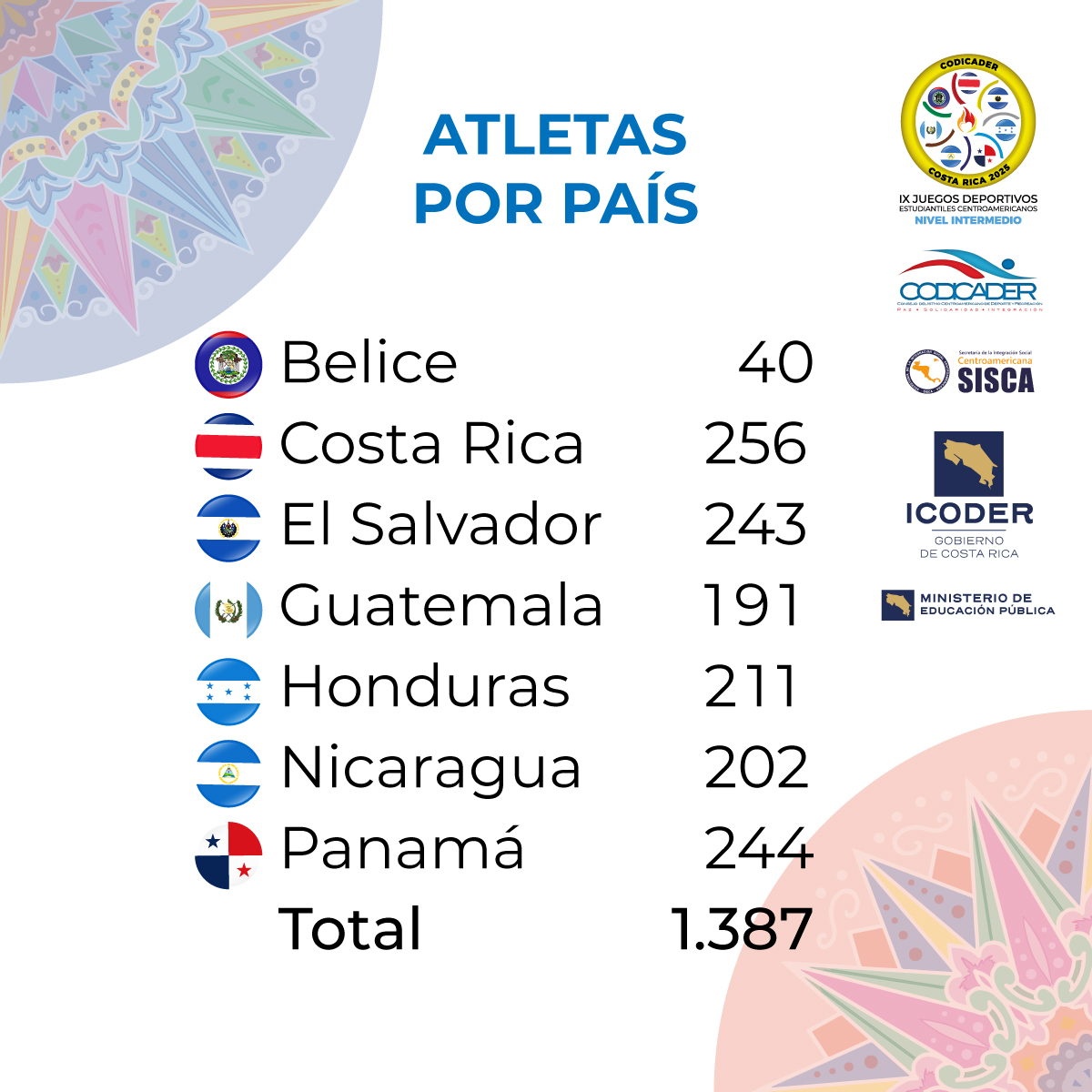 Costa Rica encabeza las delegaciones con 256 atletas, seguida de Panamá (244), El Salvador (243), Honduras (211), Nicaragua (202), Guatemala (191) y Belice (40). Sumando entrenadores, delegados, jueces, médicos y personal organizador, los Juegos reúnen a 1.882 participantes.