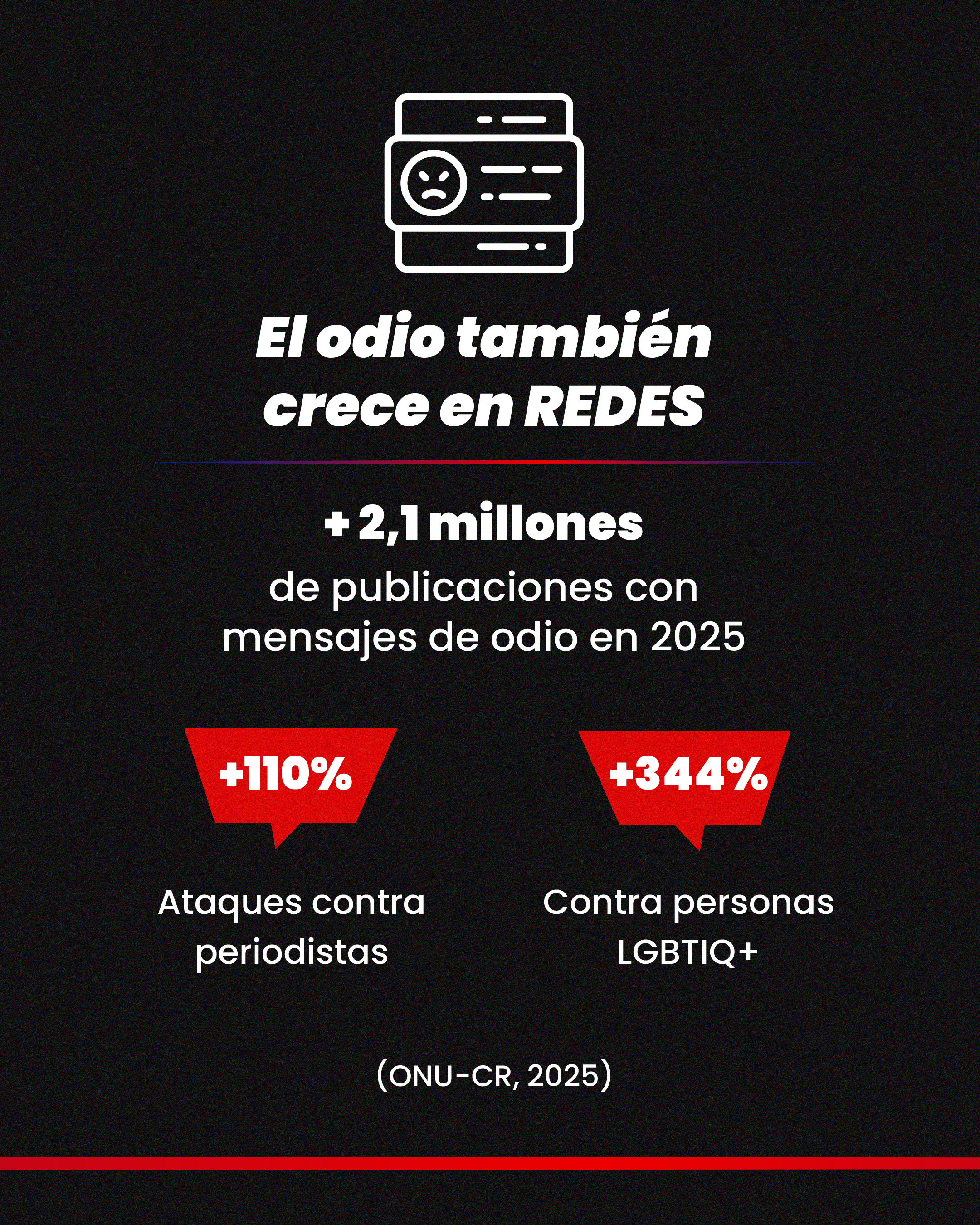 Por su parte, el Informe sobre Discursos de Odio y Discriminación de Naciones Unidas Costa Rica de 2025 reporta más de 2,1 millones de publicaciones con mensajes de odio, lo que representa un incremento del 16% en un año y del 400% desde 2021.
