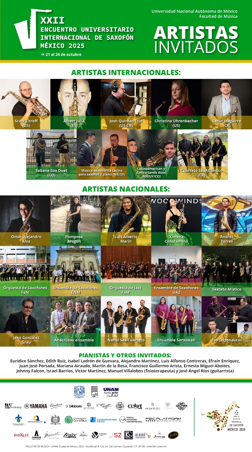 Una delegación de la Sede del Atlántico de la Universidad de Costa Rica (UCR) viajará a la Ciudad de México para participar en el XXII Encuentro Universitario Internacional de Saxofón, que se realizará del 21 al 24 de octubre, organizado por la Facultad de Música de la Universidad Nacional Autónoma de México (UNAM) bajo la coordinación del maestro Roberto Benítez.
