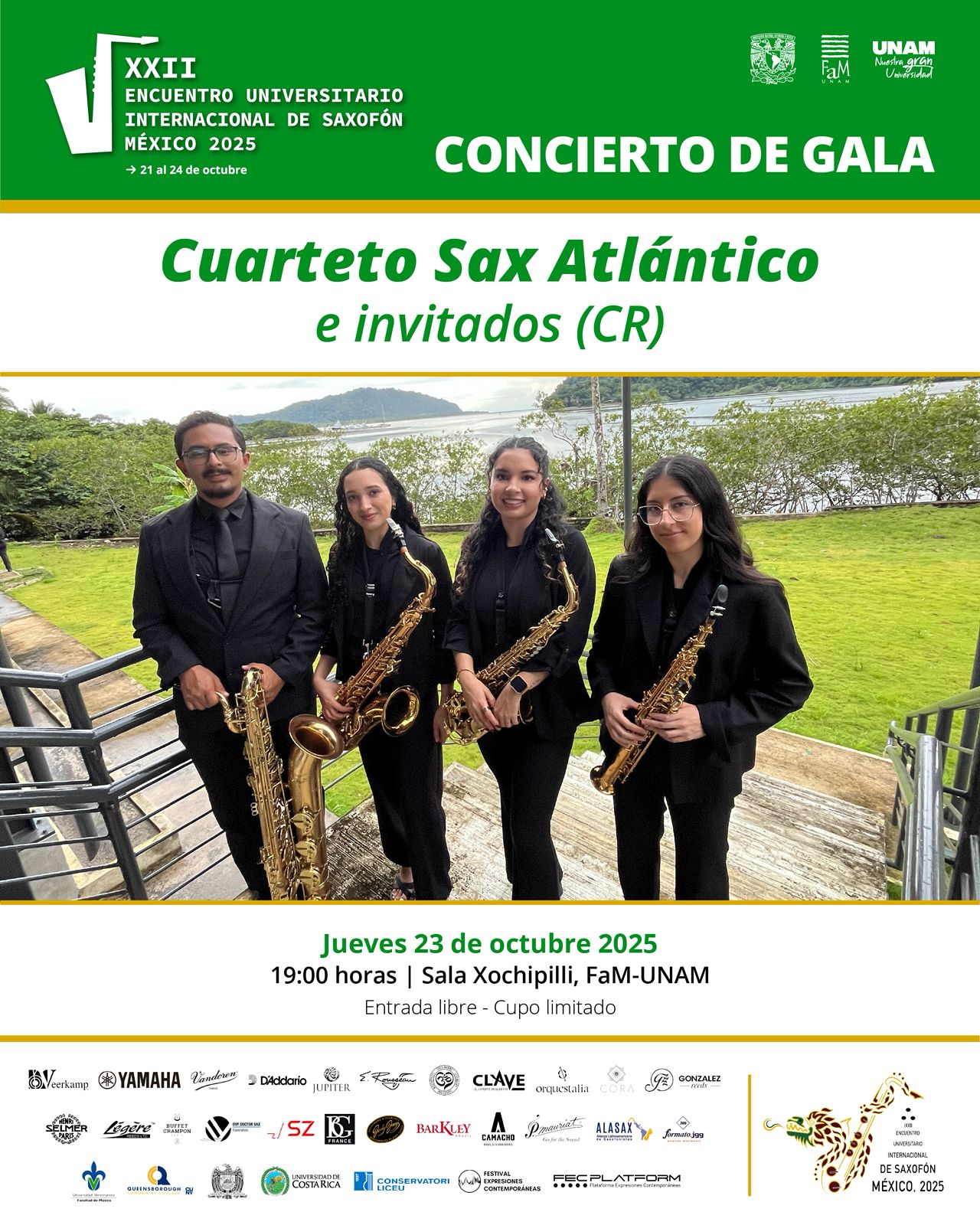Como parte central de la agenda, el Cuarteto SaxAtlántico ofrecerá un recital en la Sala Xochipilli de la UNAM. El conjunto, conformado por los estudiantes María José Jiménez Alvarado (saxofón soprano), Estefanía Acuña Fernández (saxofón alto), Yoselin Martínez Cruz (saxofón tenor) y César Pérez Calderón (saxofón barítono), interpretará un programa dedicado a la música costarricense contemporánea, incluyendo obras de Alonso Torres, Marvin Camacho, Diego Castillo, Vinicio Meza, Carlos Guzmán, Ricardo Mora, Jesús Bonilla y Fidel Gamboa.