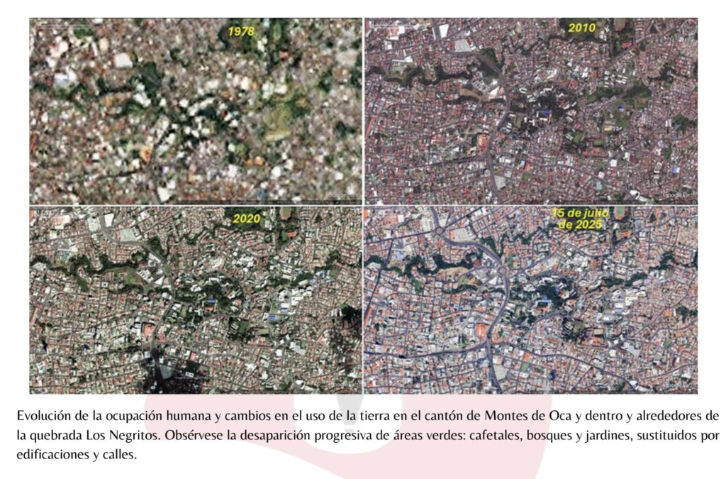 La entidad citó como ejemplo la inundación del 16 de octubre en la microcuenca de la quebrada Los Negritos, en Montes de Oca, cuya área —de apenas 2,2 km²— presenta más del 80% de su superficie urbanizada e impermeable. El evento afectó zonas frente al edificio de la Facultad de Derecho de la Universidad de Costa Rica, así como sectores del barrio Dent y sus alrededores.
