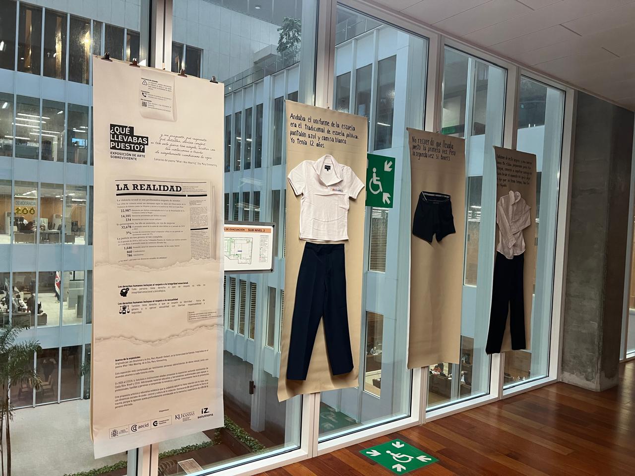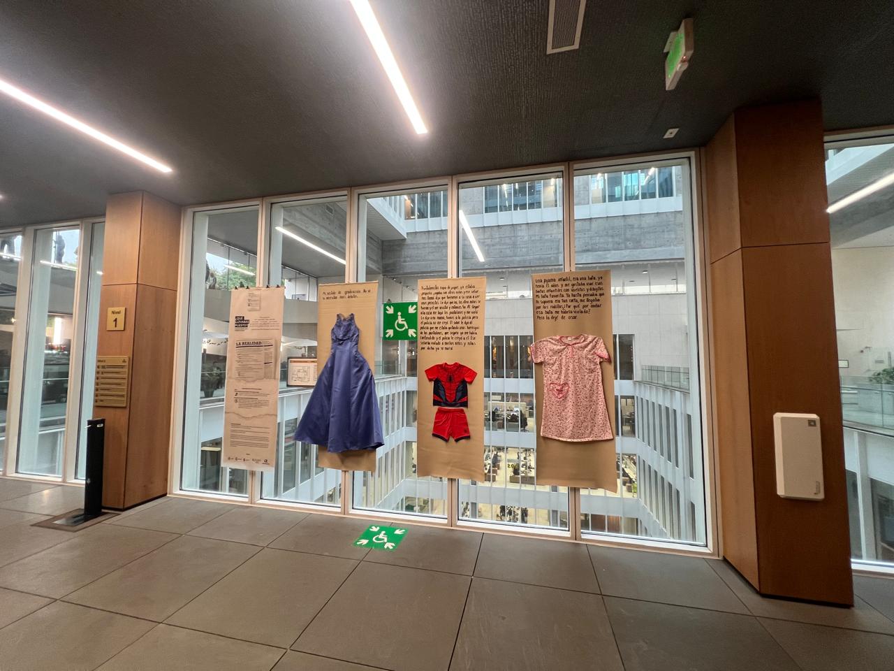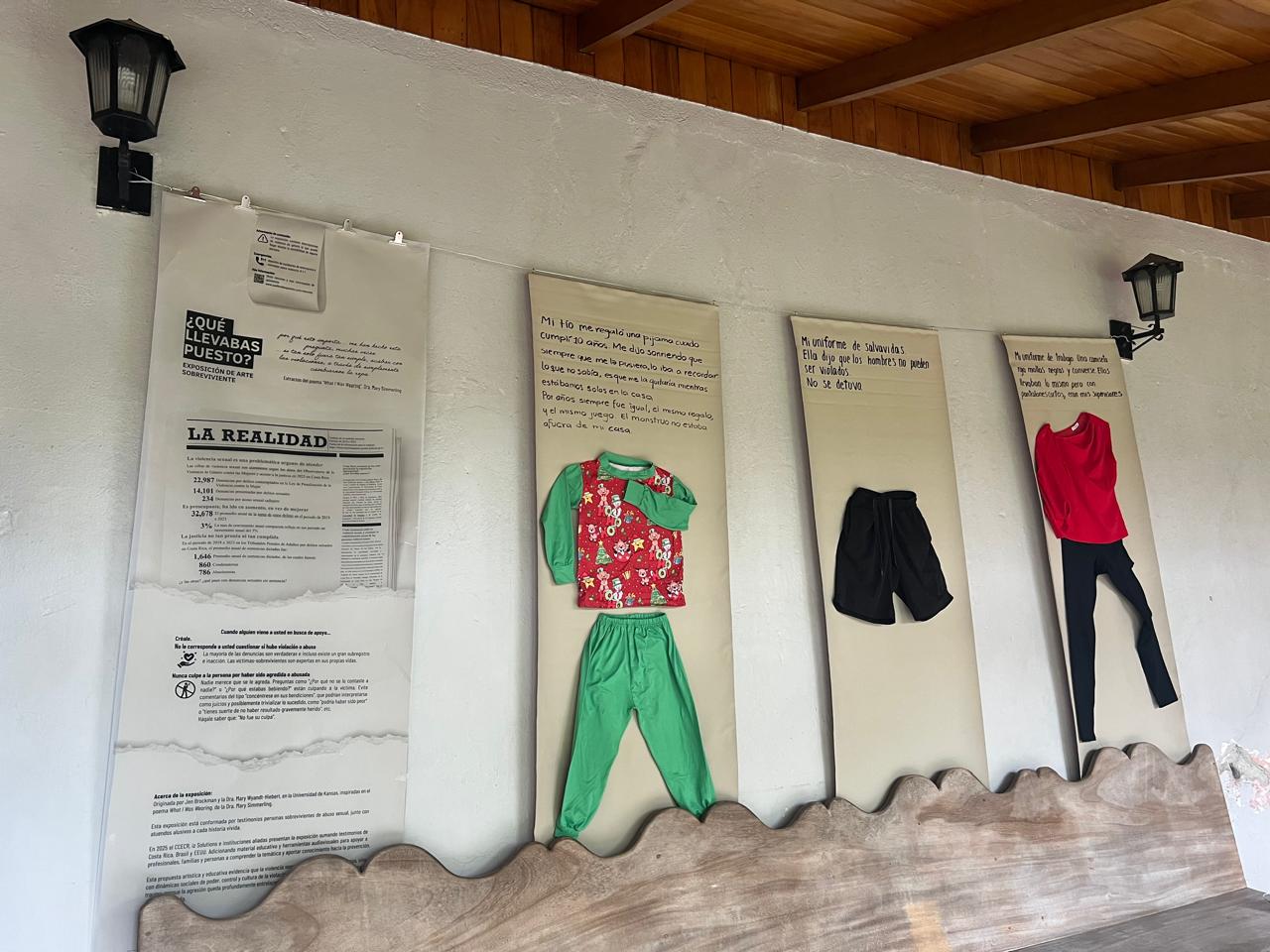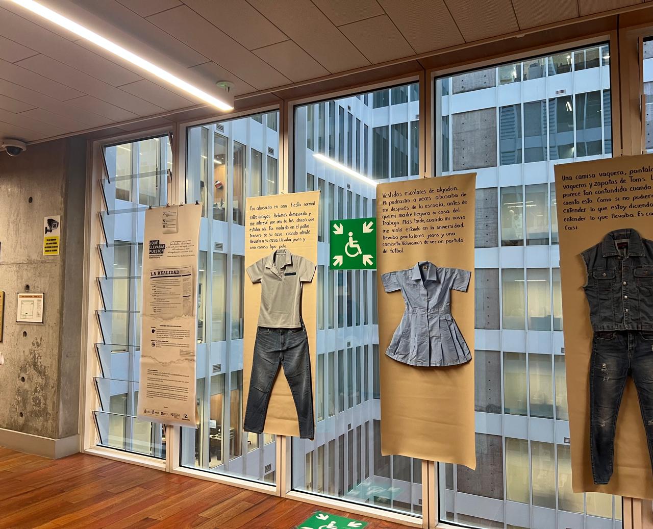 La muestra está compuesta por réplicas de los conjuntos de ropa que vestían personas sobrevivientes al momento de la agresión, acompañadas de fragmentos de sus testimonios y de materiales informativos sobre derechos, prevención y otras herramientas de apoyo.
