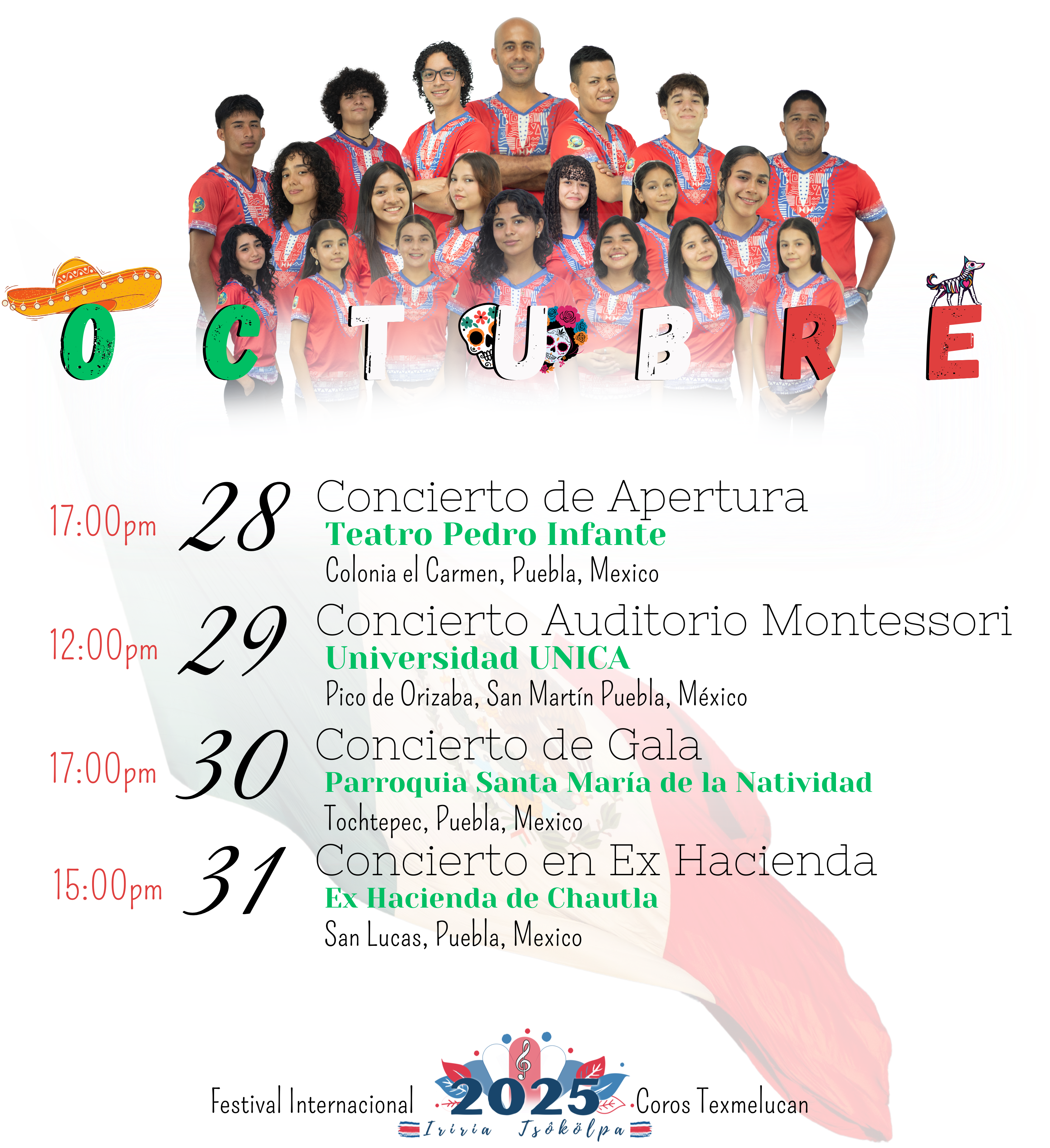 El grupo estudiantil de Música Folclórica Iriria Tsôkolpa del Liceo Experimental Bilingue de Río Jiménez, en Guácimo de Limón, estará participando en el I Festival Internacional de Coros Texmelucan 2025, en San Martín de Texmelucan en Puebla, México, del 27 al 31 de octubre, donde presentarán el folclor costarricense.