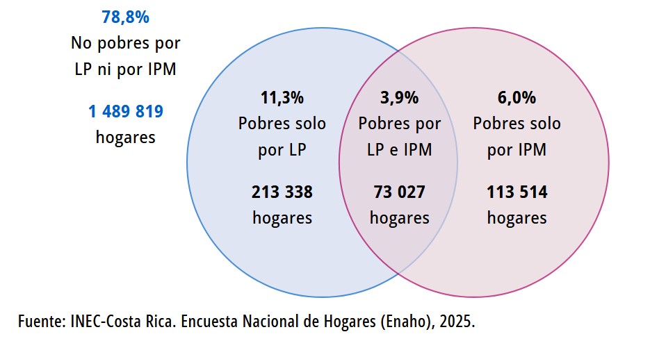 El 78,8% [de los hogares] es no pobre en ambas mediciones, el 11,3% son pobres por insuficiencia de ingresos (LP), pero no pobres multidimensionales (IPM); otro 6% son pobres por IPM, pero no por LP; el restante 3,9% de los hogares son pobres por ambos métodos, porcentaje que equivale a 73.027 hogares en el ámbito nacional”.