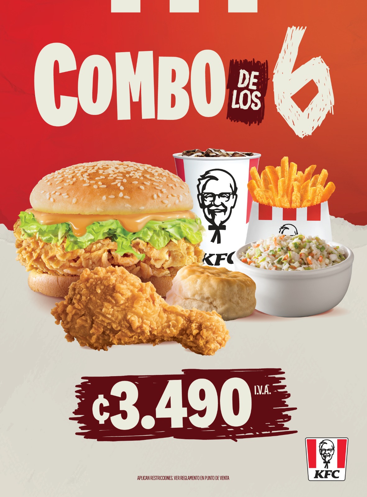 El Combo de los 6 incluye una pieza de pollo, una hamburguesa, papas pequeñas, ensalada pequeña, un biscuit y una bebida por ₡3.490. Con seis elementos del menú, la nueva oferta está diseñada para quienes buscan una comida completa y de calidad a un precio accesible. Estará disponible a partir del 3 de octubre en todos los restaurantes del país, así como en autoservicio, app móvil y plataformas de delivery.