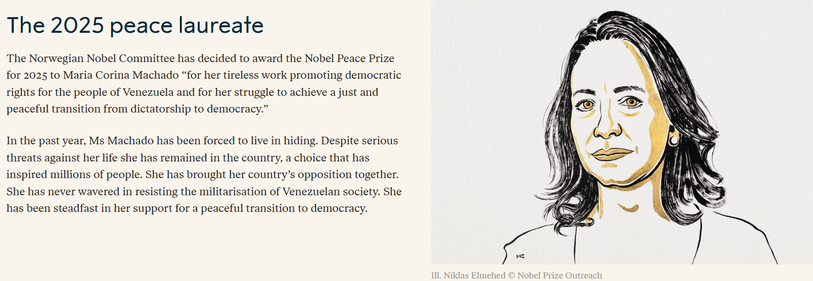La política venezolana fue galardonada por su lucha por la libertad y la democracia en Venezuela, según anunció el Comité Noruego del Nobel.