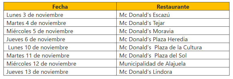 La Ruta de Empleo se llevará a cabo del 3 al 13 de noviembre, en horario de 8:00 a. m. a 4:00 p. m., en varios restaurantes de McDonald’s a nivel nacional y en la Municipalidad de Alajuela.