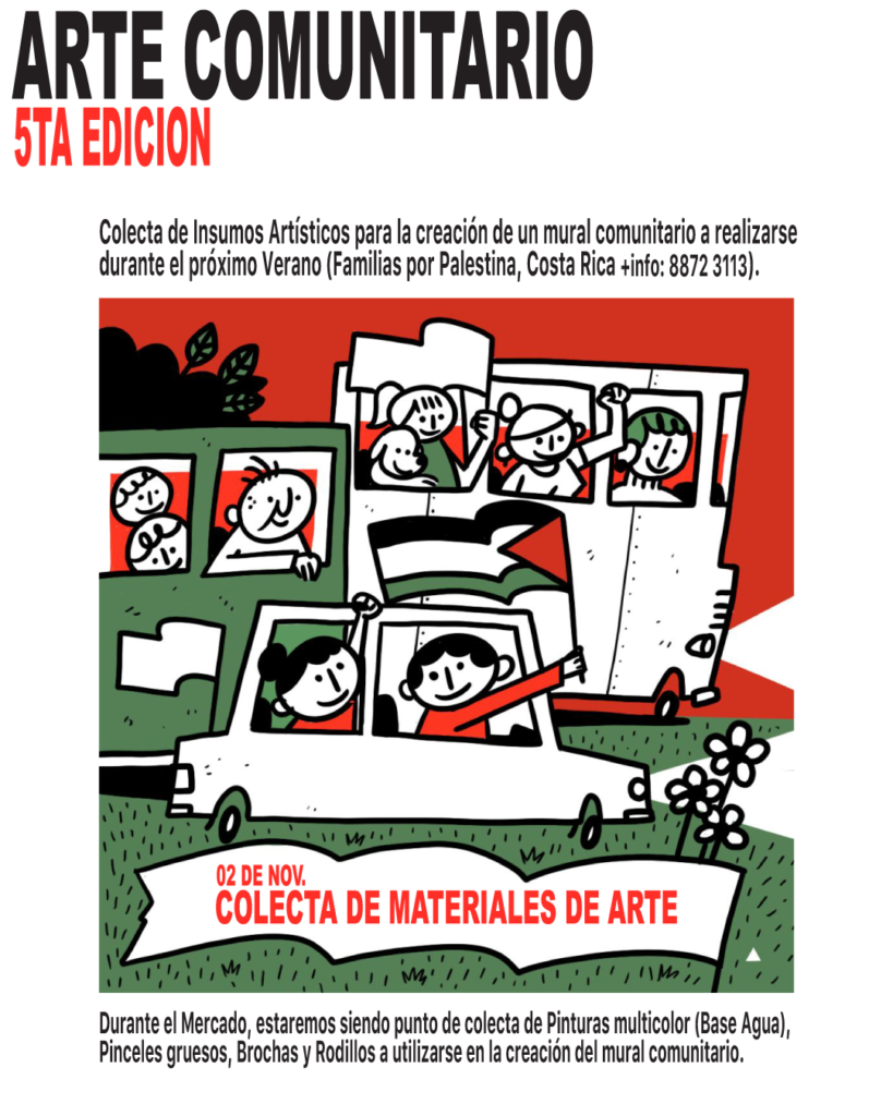 El próximo domingo 2 de noviembre de 2025, el espacio Contraforma, en Los Yoses, será sede de la quinta edición del Mercado Solidario por Palestina, una jornada cultural y benéfica en la que el 100% de lo recaudado será donado a familias palestinas en Gaza y Cisjordania.