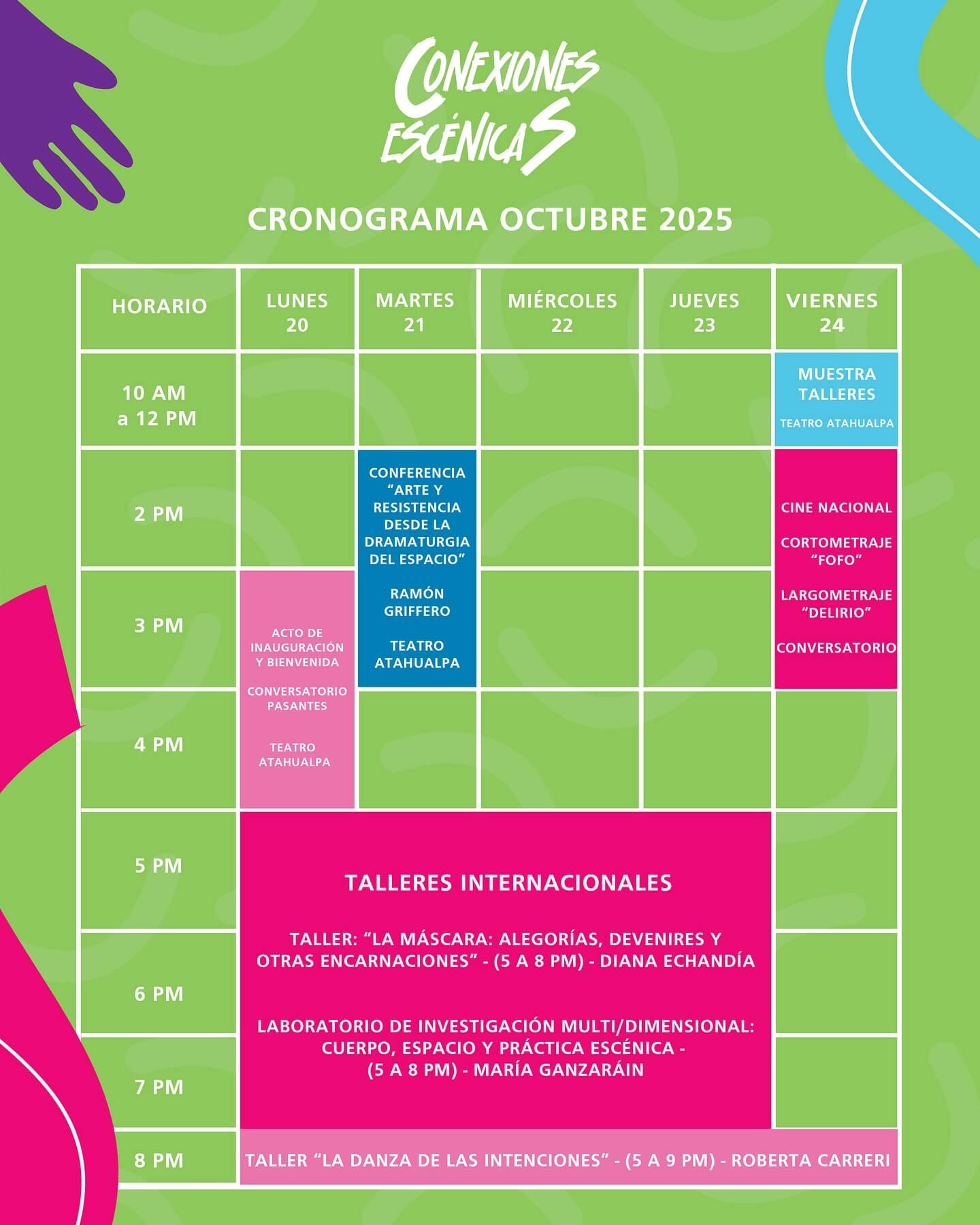 La programación comenzará el lunes 20 de octubre con el acto inaugural y un conversatorio de pasantes. El martes 21, el dramaturgo chileno Ramón Griffero, referente del teatro político latinoamericano, ofrecerá la conferencia “Arte y resistencia desde la dramaturgia del espacio”.