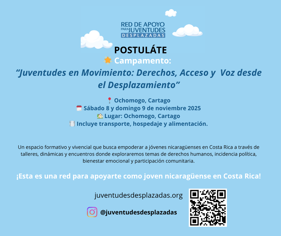 El próximo 8 y 9 de noviembre la iniciativa realizará en San José el Campamento “Juventudes en movimiento: derechos, acceso y voz desde el desplazamiento”, un espacio formativo y vivencial dirigido a jóvenes nicaragüenses de 18 a 35 años residentes en Costa Rica.