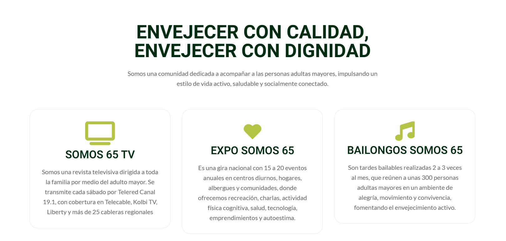 - Más de 300 ediciones de SOMOS 65 TV, programa informativo a nivel nacional con enfoque en la población adulta mayor.