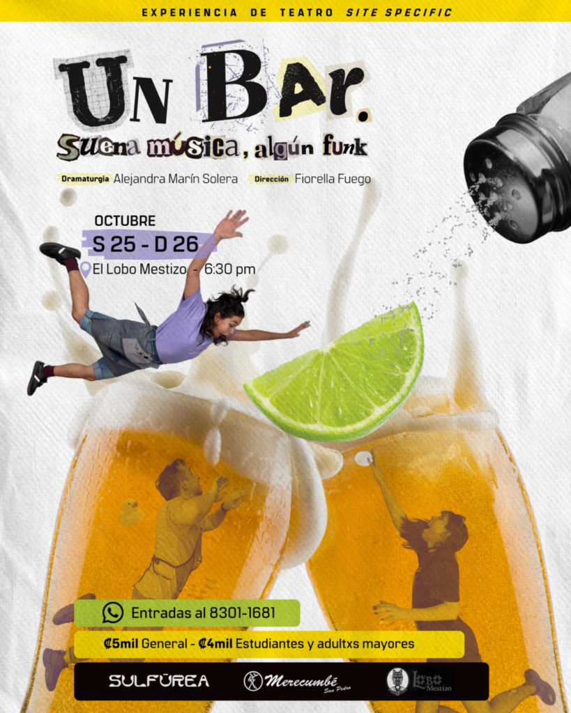 El bar se convierte en escenario y el público en cómplice en Un Bar. Suena música, algún funk, una obra de teatro independiente que propone una experiencia inmersiva, cercana y vivencial. Las funciones se realizarán el sábado 25 y domingo 26 de octubre, a las 6:30 p.m., en El Lobo Mestizo (segundo piso, San José centro).