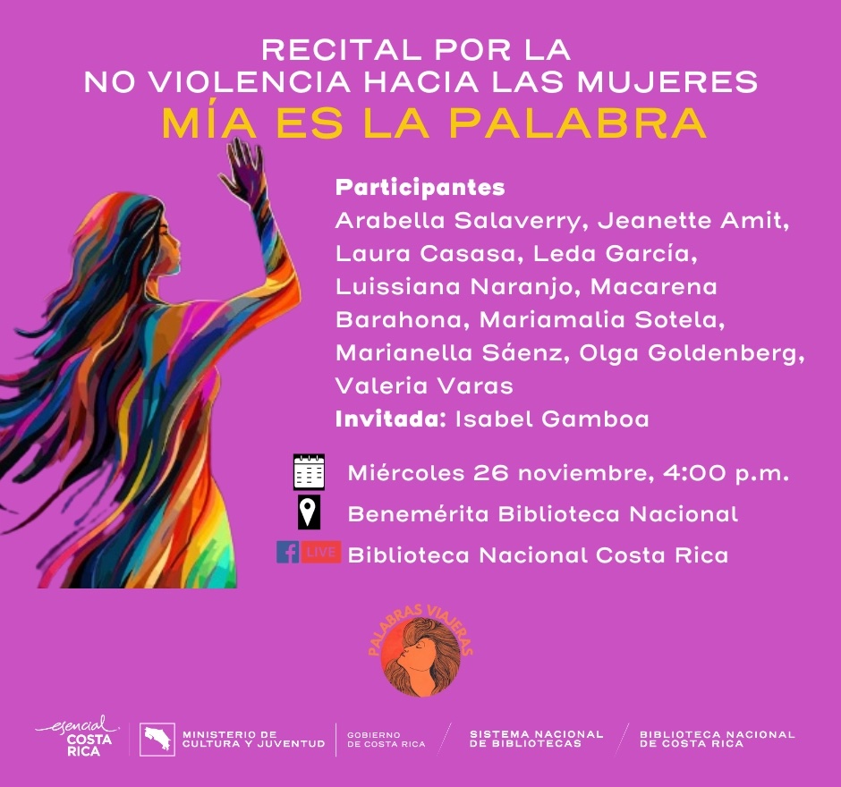 Recital poético dirigido por el colectivo Palabras Viajeras, con textos que visibilizan la violencia contra las mujeres y apelan a la sororidad, la memoria y la esperanza. Participan escritoras nacionales con obras que denuncian, sensibilizan y proponen nuevas miradas desde la literatura.