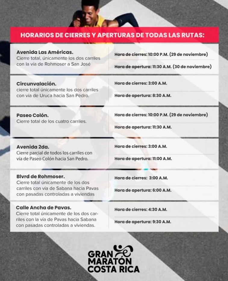 La organización de la Gran Maratón Costa Rica informó sobre los cierres viales programados para este domingo 30 de noviembre, con el fin de garantizar la seguridad de los atletas y el correcto desarrollo del evento. La carrera, Gran Maratón de Costa Rica, denominada “Ruta del Corazón”, recorrerá todo el sentido interno del Anillo de Circunvalación, la Calle Ancha de Pavas, la Avenida de las Américas, el Paseo Colón y la Avenida Segunda.