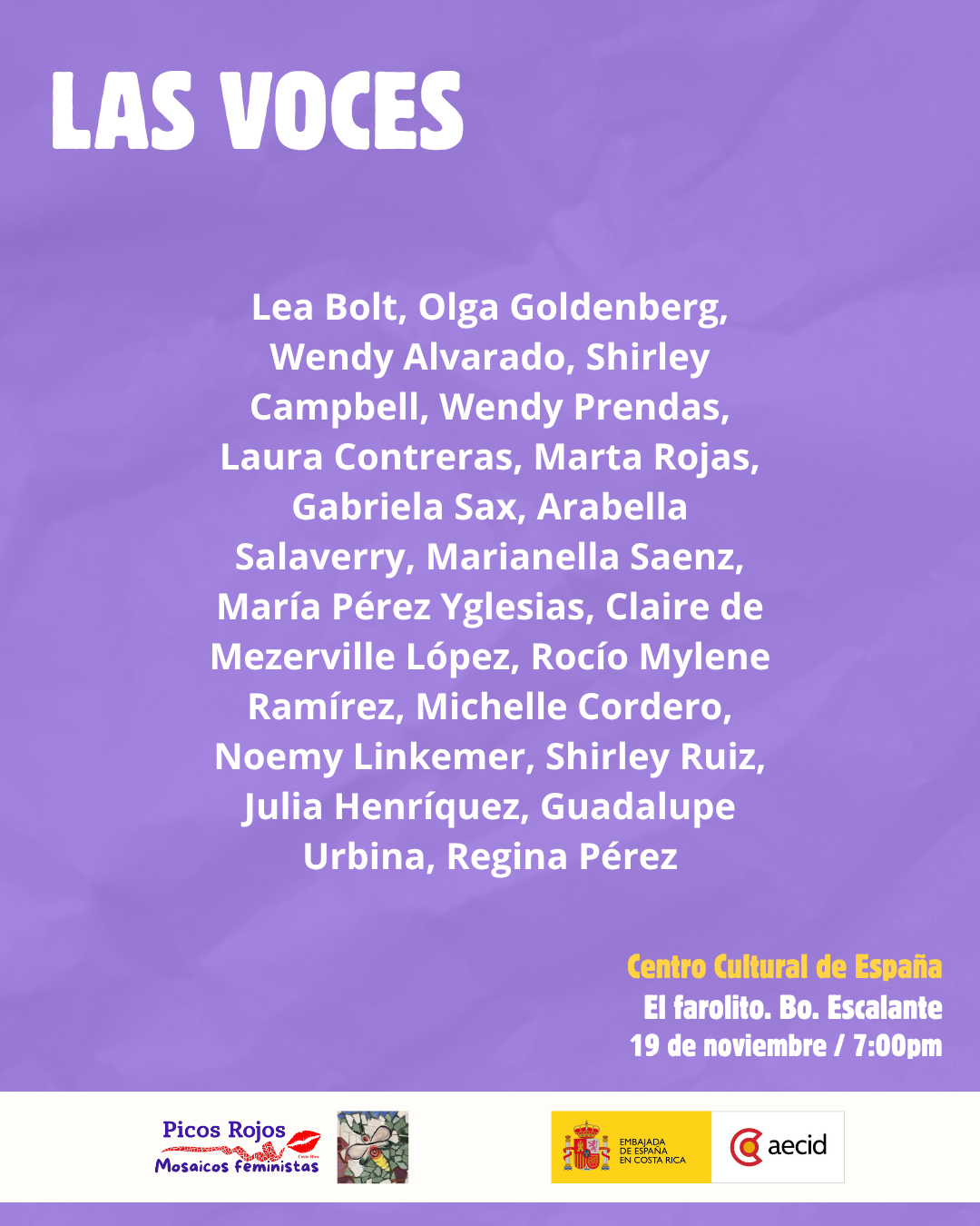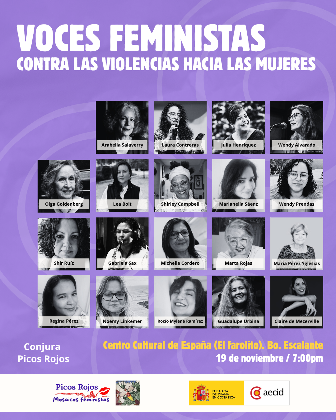 Con motivo del Día Internacional de la Eliminación de la Violencia contra las Mujeres, los colectivos Picos Rojos CR y Mosaicos Feministas invitan al público al encuentro Voces feministas contra las violencias hacia las mujeres, que se realizará el martes 19 de noviembre a las 6:00 p.m. en el Centro Cultural Español, en Barrio Escalante.