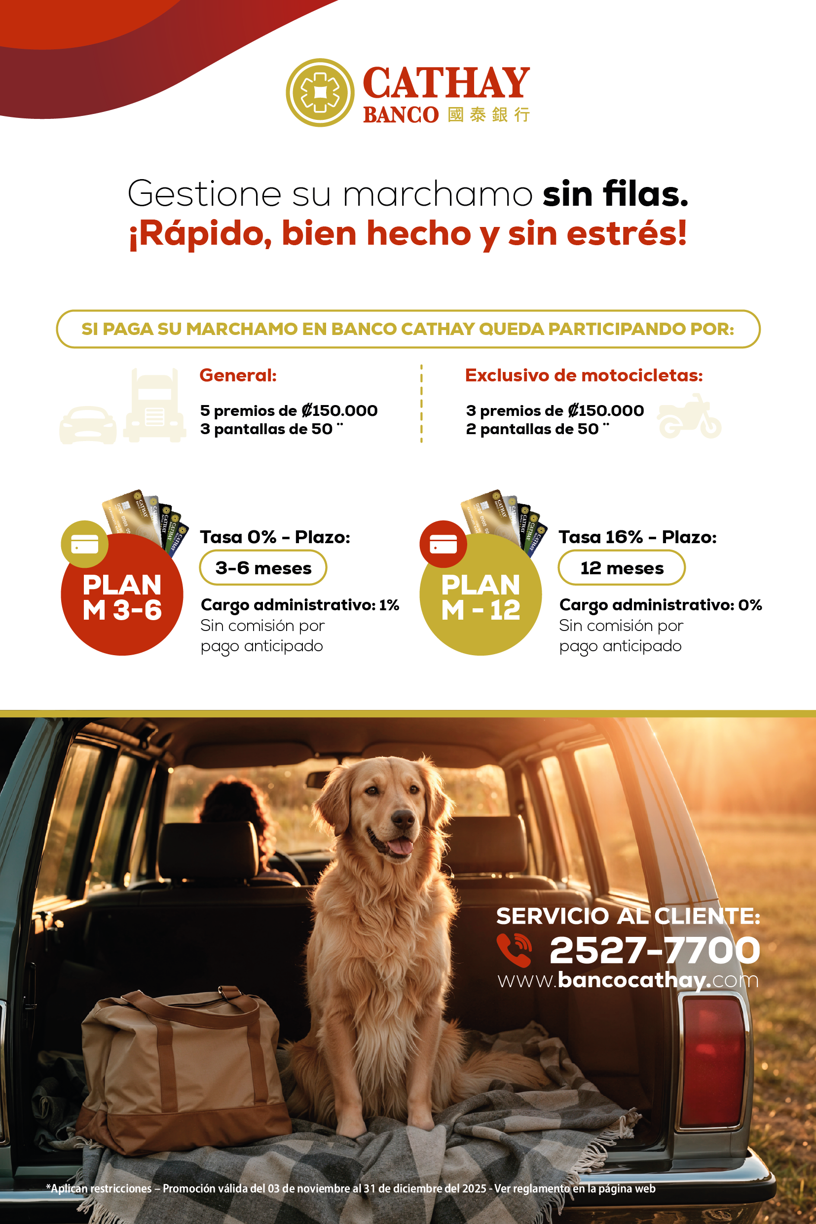 Banco Cathay ofrece el pago del marchamo 2026 con opciones de financiamiento mediante tarjetas de crédito: el Plan M 3-6 a 0% interés por 3 a 6 meses con 1% de cargo administrativo y el Plan M-12 a 16% interés por 12 meses, ambos sin comisión por pago anticipado.