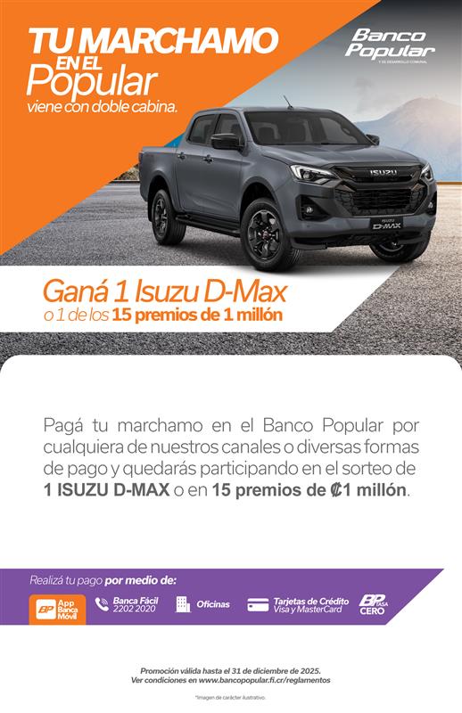 El Banco Popular y de Desarrollo Comunal invita a pagar el marchamo 2026 con su promoción Tu Marchamo en el Popular viene doble cabina, vigente hasta el 31 de diciembre de 2025. Quienes realicen el pago por los canales oficiales del banco participarán en el sorteo de un vehículo Isuzu D-Max full extras y 15 premios de ₡1 millón cada uno.