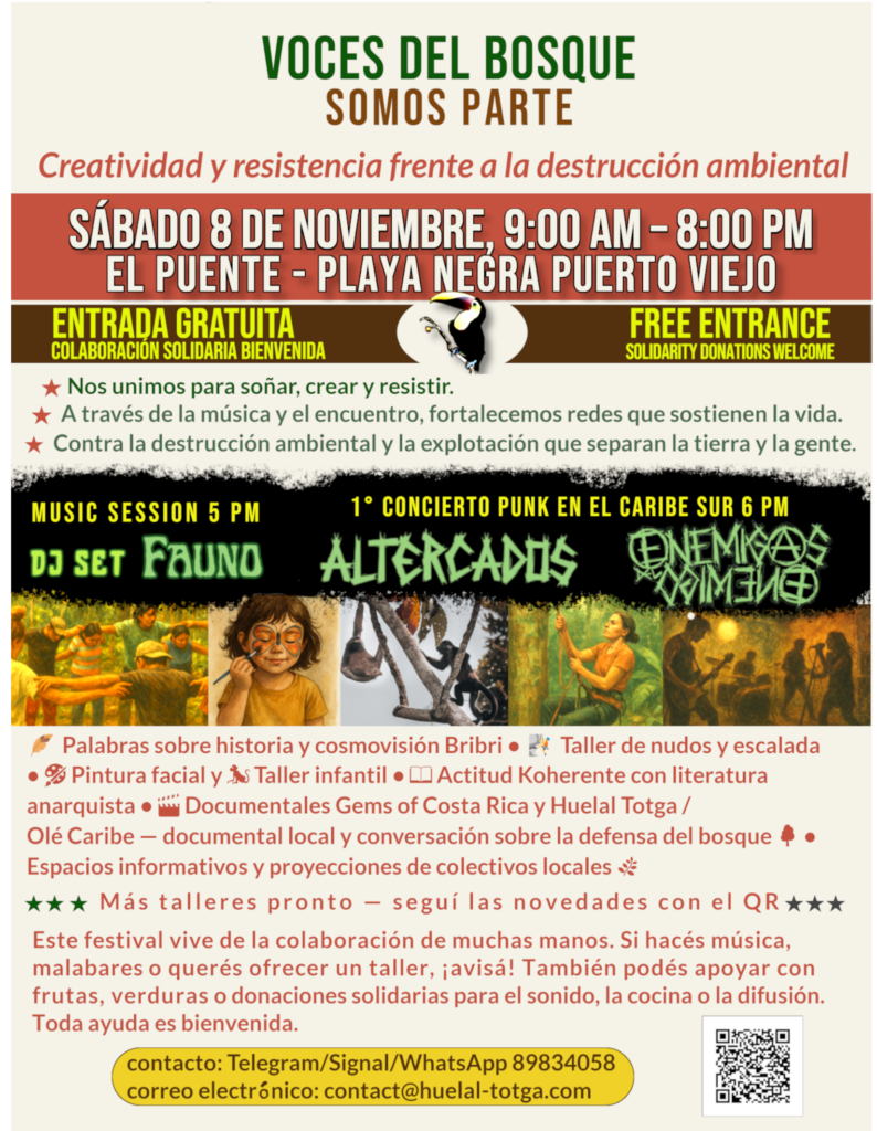 El programa incluye una charla sobre la cosmovisión e historia del pueblo bribri, talleres de nudos y escalada, actividades artísticas para niñas y niños, y la proyección de los documentales Gems of Costa Rica y Huelal Totga – Olé Caribe, seguidos de un espacio de conversación comunitaria. La música estará a cargo de DJ Fauno y las bandas punk Altercados y Enemigxs del Enemigo.