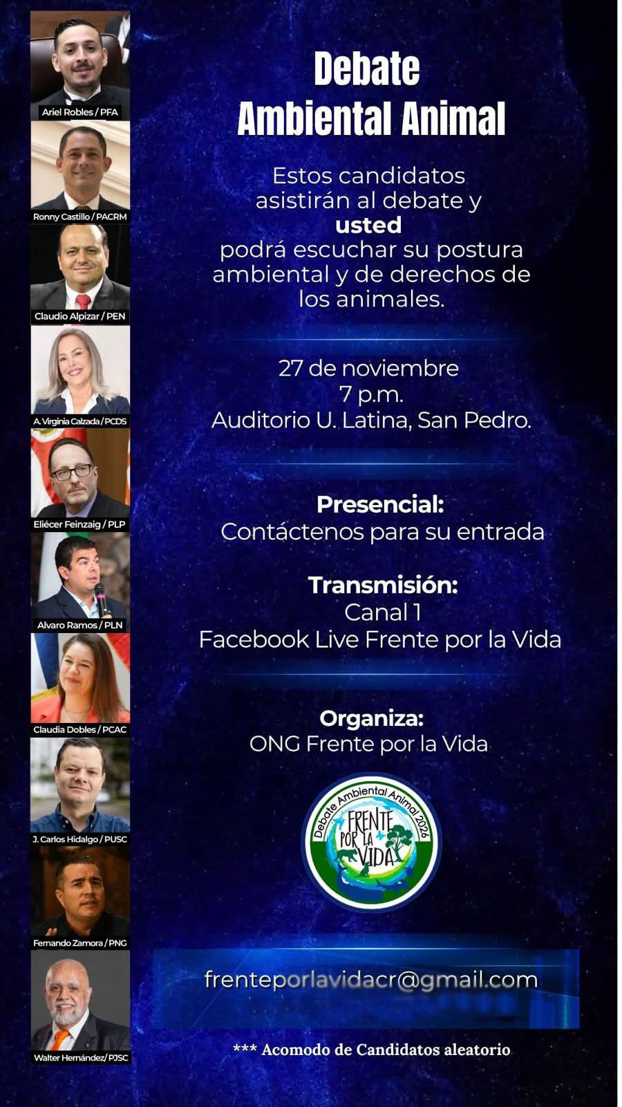 Este jueves 27 de noviembre a las 7:00 p.m., en el Auditorio del Edificio C de la Universidad Latina de Costa Rica, sede San Pedro, se llevará a cabo el Debate Ambiental y Animal 2025, un espacio inédito que reunirá a 10 candidatas y candidatos presidenciales para exponer sus propuestas en dos temas fundamentales para el país: la protección del ambiente y el bienestar animal.