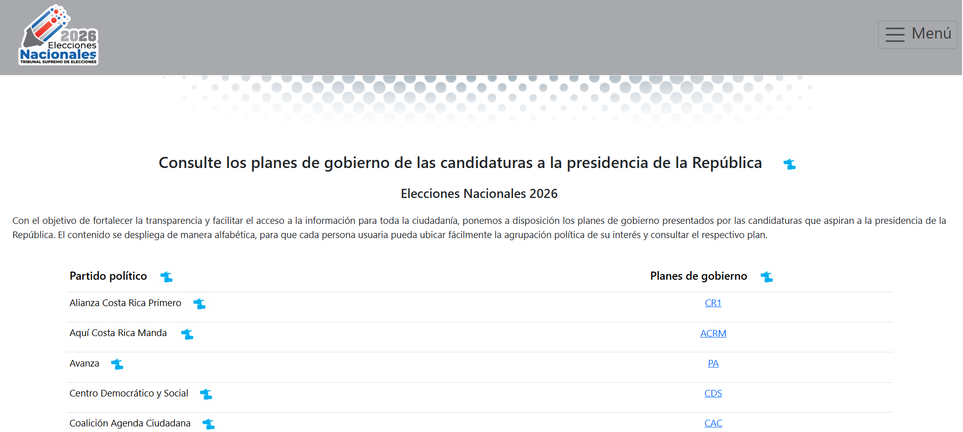 El Tribunal Supremo de Elecciones (TSE) puso a disposición del público los planes de gobierno de las 20 candidaturas presidenciales que competirán en las elecciones nacionales de 2026.