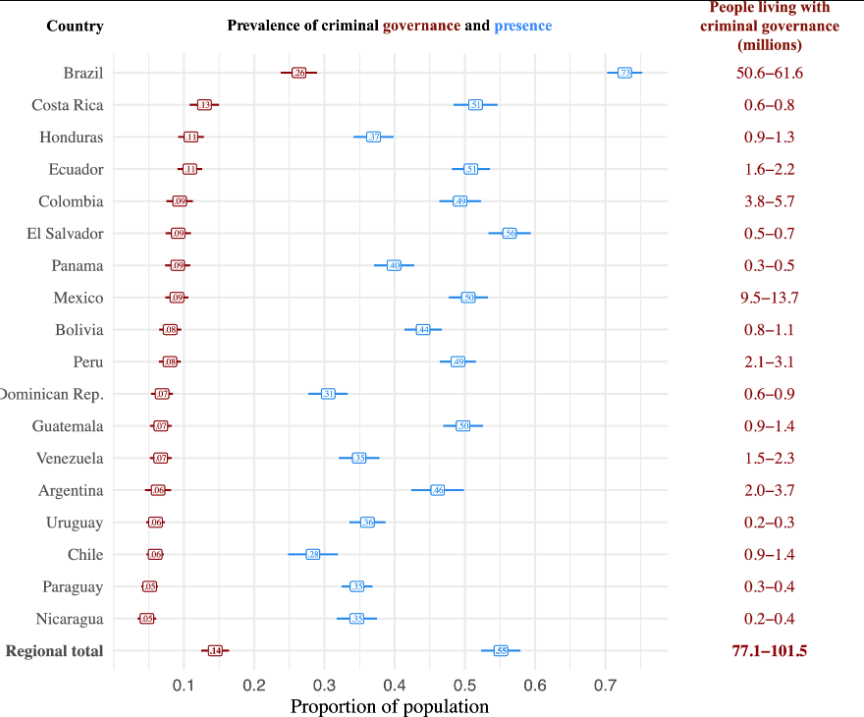 Un estudio reciente, Criminal Governance in Latin America: Prevalence and Correlates (Uribe, Lessing, Schouela y Stecher, 2025), confirma esa tendencia. Según sus hallazgos, una de cada cuatro localidades latinoamericanas muestra signos de gobernanza criminal: estructuras paralelas que administran justicia, cobran “impuestos” o imponen reglas de convivencia. Costa Rica aparece como el segundo país con mayor prevalencia de gobernanza criminal en toda la región, solo por detrás de Brasil. Los autores atribuyen el dato a la rápida escalada de homicidios de 2023 y advierten que incluso los Estados con alta capacidad institucional —como el nuestro— ya muestran formas sustantivas de control criminal en zonas donde el Estado retrocede y la autoridad se privatiza de facto.