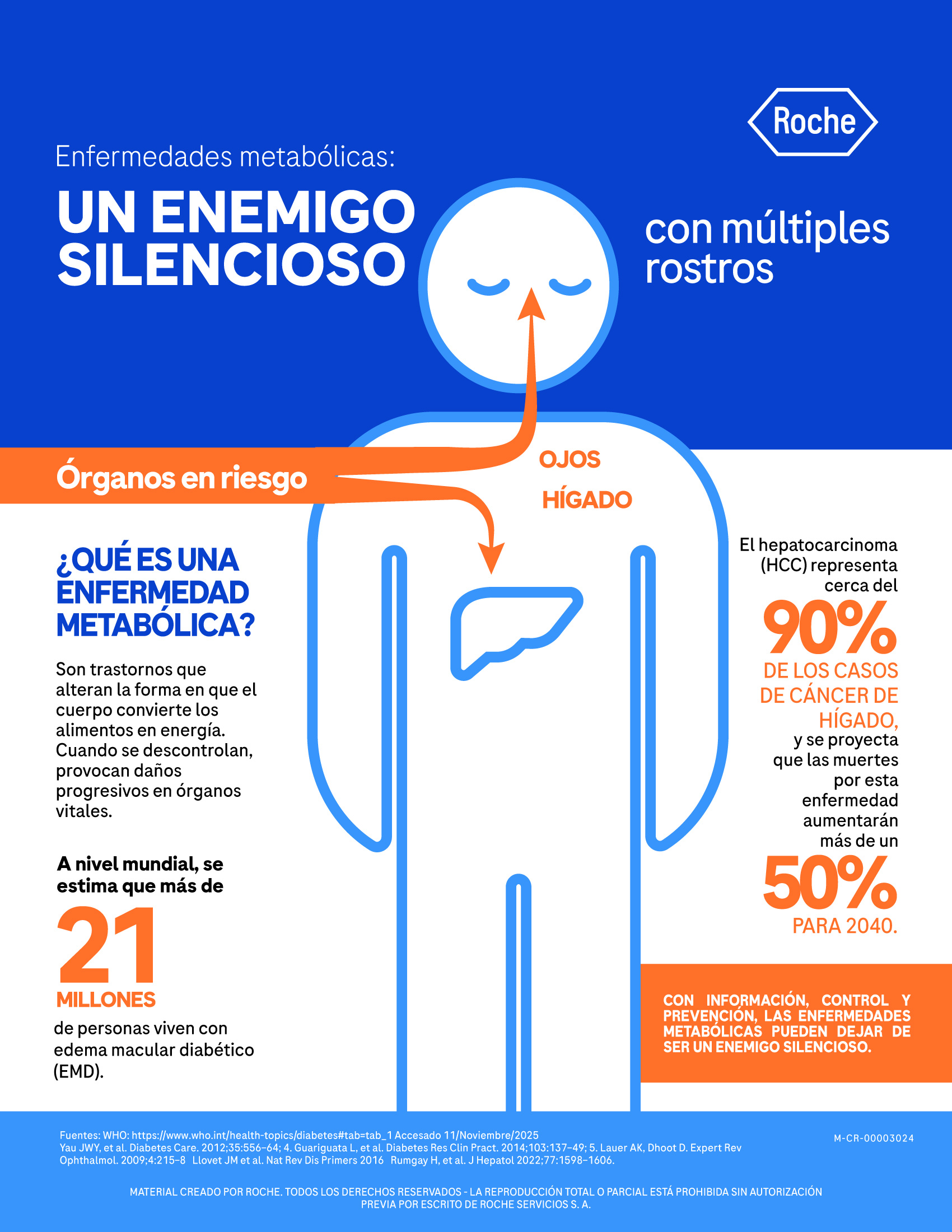 Las enfermedades metabólicas avanzan de forma silenciosa, pero están detrás del incremento de complicaciones graves como el cáncer de hígado y el edema macular diabético. Por esa razón, Roche recomienda a las personas buscar un abordaje integral de estos trastornos más allá del control de la glucosa y entender su impacto sistémico en el cuerpo.