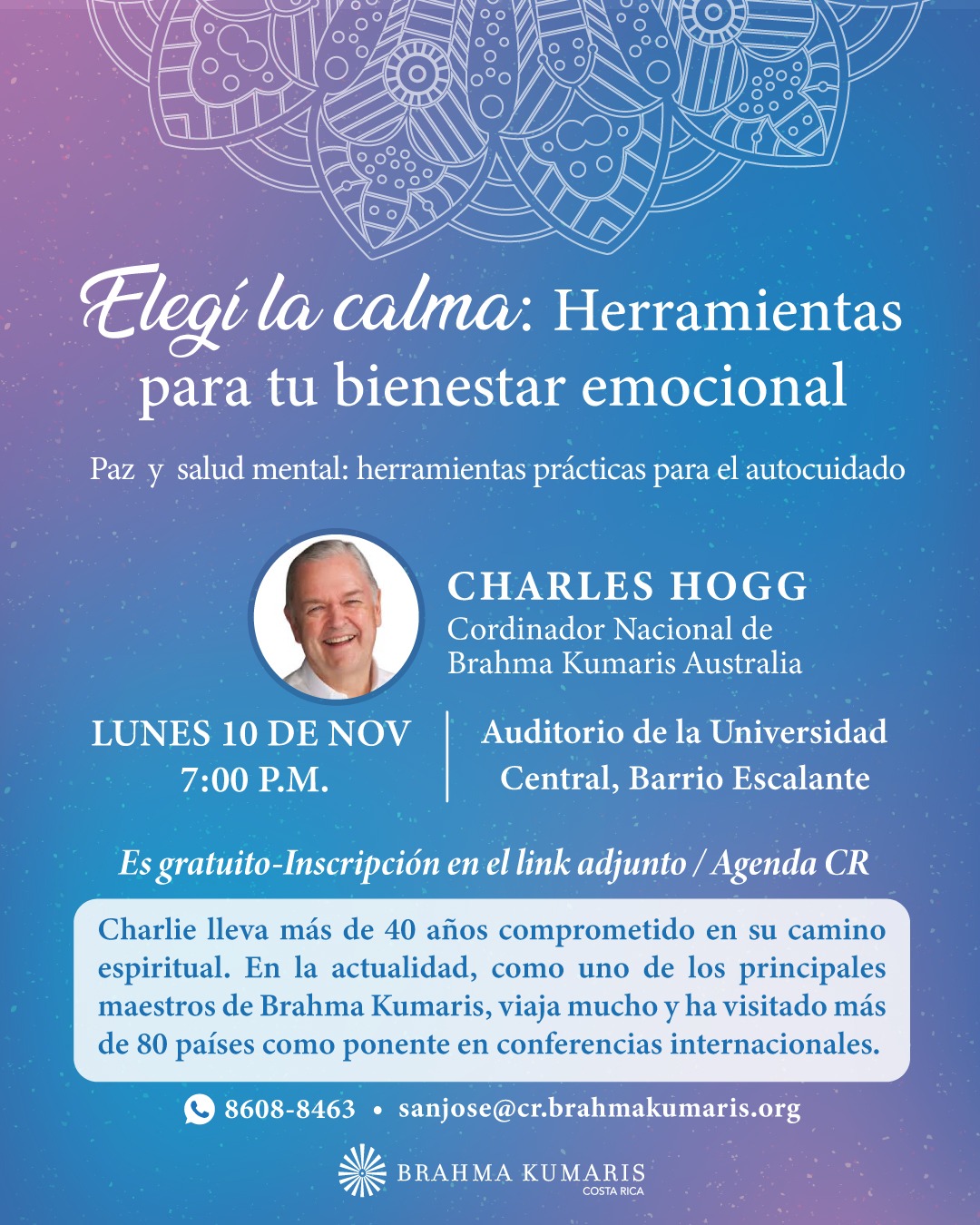 Brahma Kumaris Costa Rica se complace en anunciar la visita de Charles Hogg, reconocido maestro de meditación con una trayectoria de más de cuatro décadas, quien ofrecerá una charla pública y gratuita titulada "Elegí la calma: Herramientas para tu bienestar emocional".