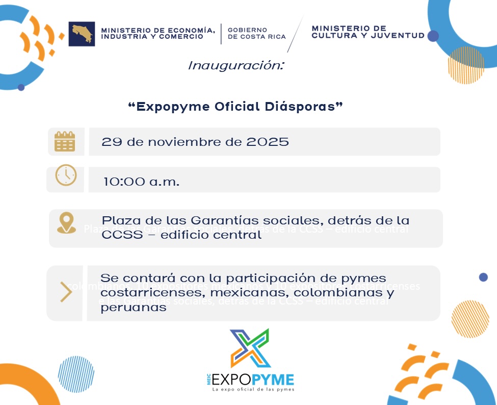 El Ministerio de Economía, Industria y Comercio (MEIC), en alianza con el Ministerio de Cultura y Juventud (MCJ), las embajadas de Colombia y Perú, y la Cámara de Industria y Comercio Costa Rica–México (CICOMEX), realizará este sábado 29 y domingo 30 de noviembre la EXPOPYME Oficial Diásporas, un evento que reunirá a emprendedores y pymes de cuatro países con el fin de promover la empresariedad, la innovación y el intercambio cultural.