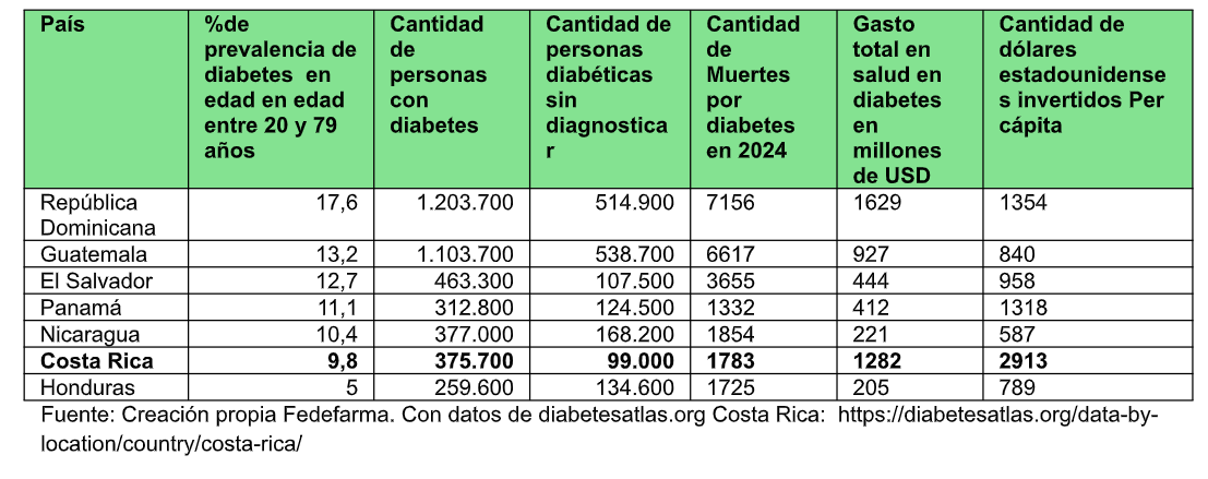 De acuerdo con la Federación Internacional de Diabetes (IFD), en su Atlas y su más reciente informe 2025, Costa Rica registra 375.700 personas con diabetes en edad entre los 20 y 79 años, 99 mil personas sin diagnosticar, invierte $1282 millones en esta enfermedad al año y el año pasado registró 1783 muertes por su causa. Para el año 2050, estima que en el país vivirán 544.100 personas adultas con diabetes.