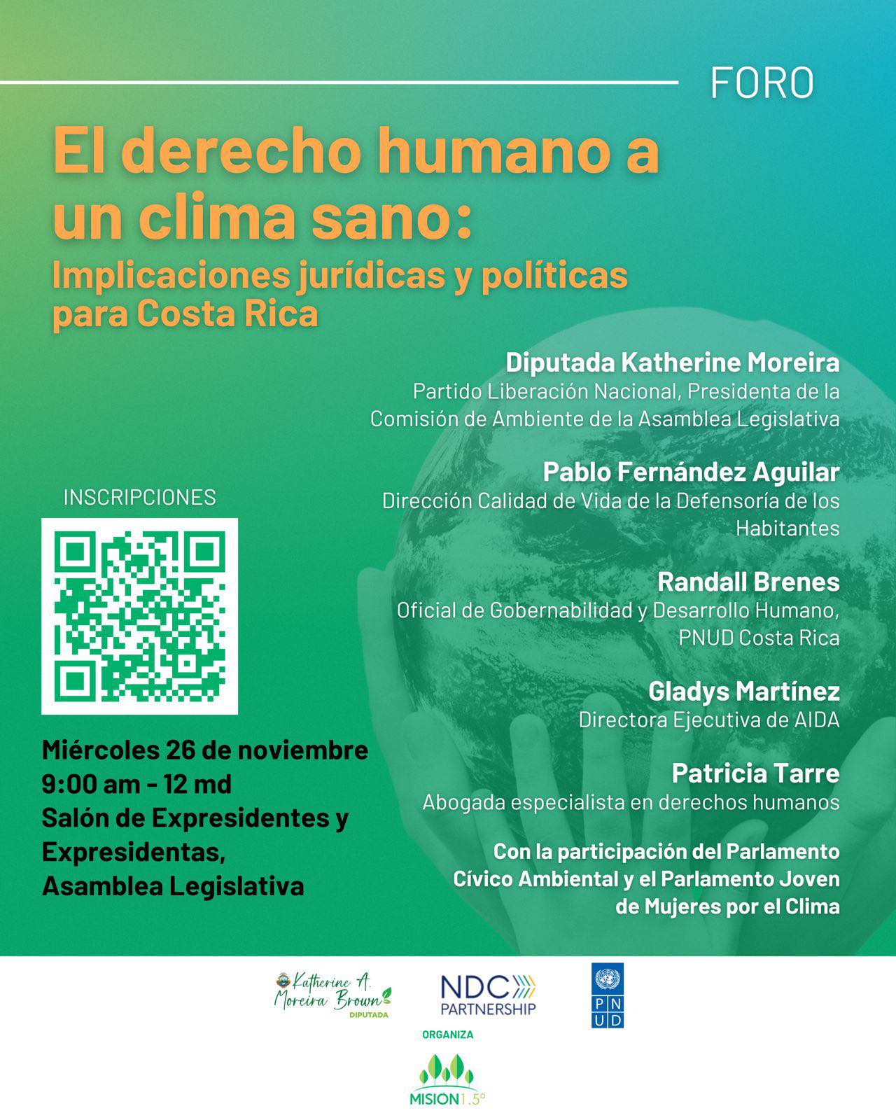 El despacho de la diputada Katherine Moreira Brown, en coordinación con MISIÓN 1.5°, el Programa de las Naciones Unidas para el Desarrollo (PNUD) y la NDC Partnership, realizará el foro El derecho humano a un clima sano: implicaciones jurídicas y políticas para Costa Rica el próximo miércoles 26 de noviembre, de 9:00 a.m. a 12:00 m.d., en el Salón de Expresidentes y Expresidentas de la Asamblea Legislativa.