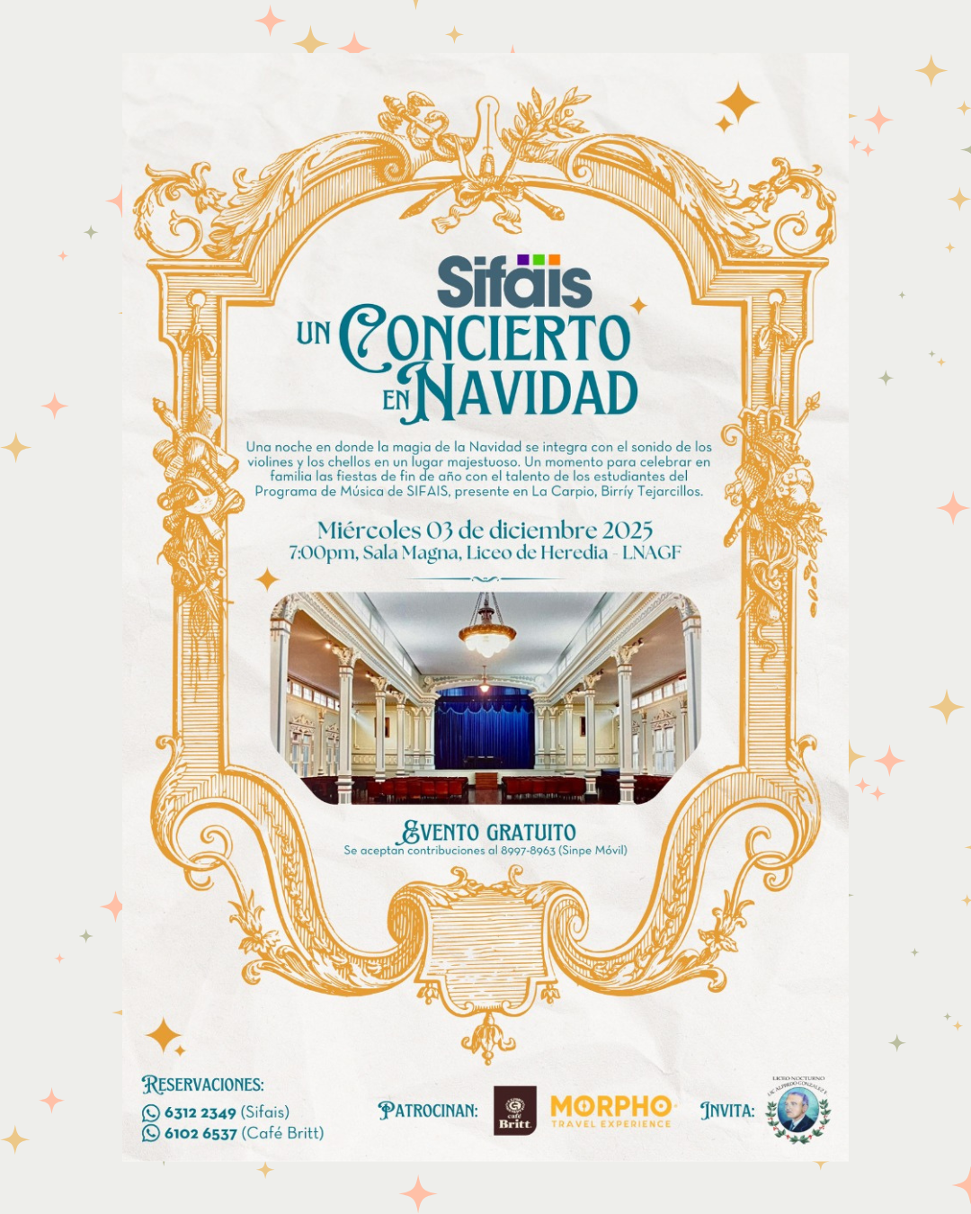 La Fundación SIFAIS invita al público a Un Concierto de Navidad, la celebración artística tradicional que marca la apertura oficial del mes de diciembre. Este evento reunirá a más de 100 artistas, entre niñas, niños, jóvenes y hasta adultos mayores de las comunidades de La Carpio, Birrí y Tejarcillos, quienes presentarán un repertorio lleno de esperanza, talento y espíritu navideño.