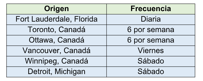 26 rutas directas que conectan con Estados Unidos, Canadá y Europa a través de 12 operadores aéreos.