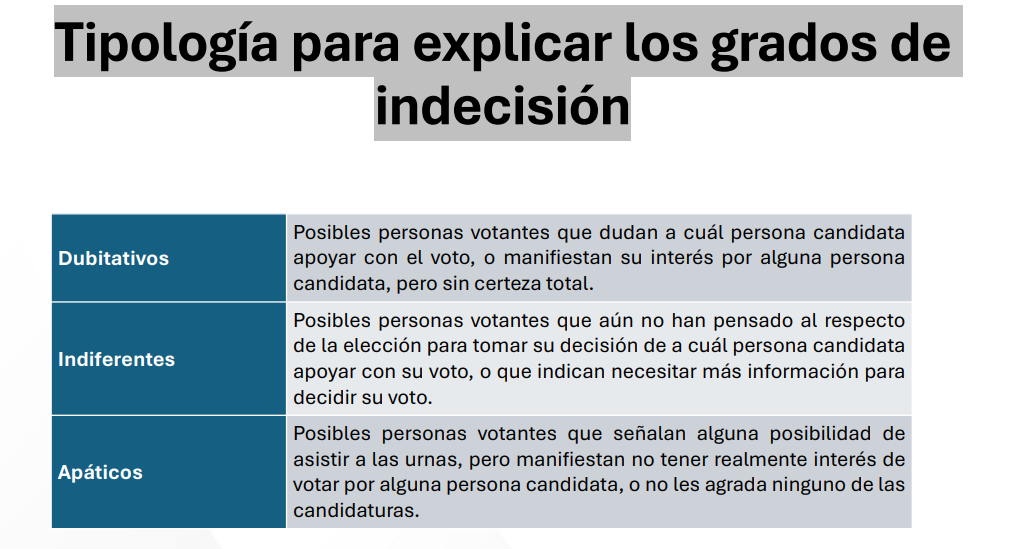 El informe destaca que más de la mitad de la población (52,4%) aún no ha decidido su voto. De ese grupo, un 61,4% afirma que “le falta información para elegir por cuál candidato votar”, un 18,2% dice “aún no he pensado por quién votar” y un 16,9% sostiene que “no estoy seguro/a de cuál candidato apoyar con mi voto”.