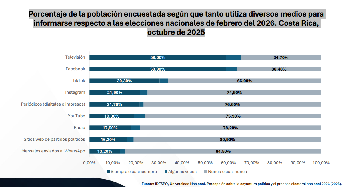 Sobre las fuentes de información política, la encuesta revela que la televisión (59%) y Facebook (58,9%) son los medios más utilizados. Les siguen TikTok (30,3%), Instagram (21,9%), periódicos (21,7%) y YouTube (19,3%).