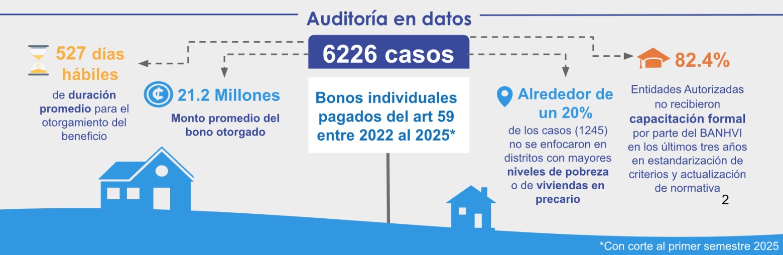 La Contraloría General de la República (CGR) reveló deficiencias significativas en la gestión del Banco Hipotecario de la Vivienda (BANHVI) para la asignación de bonos individuales del artículo 59 del Sistema Financiero Nacional para la Vivienda (SFNV), que se financian con recursos del Fondo de Subsidios para la Vivienda (FOSUVI).